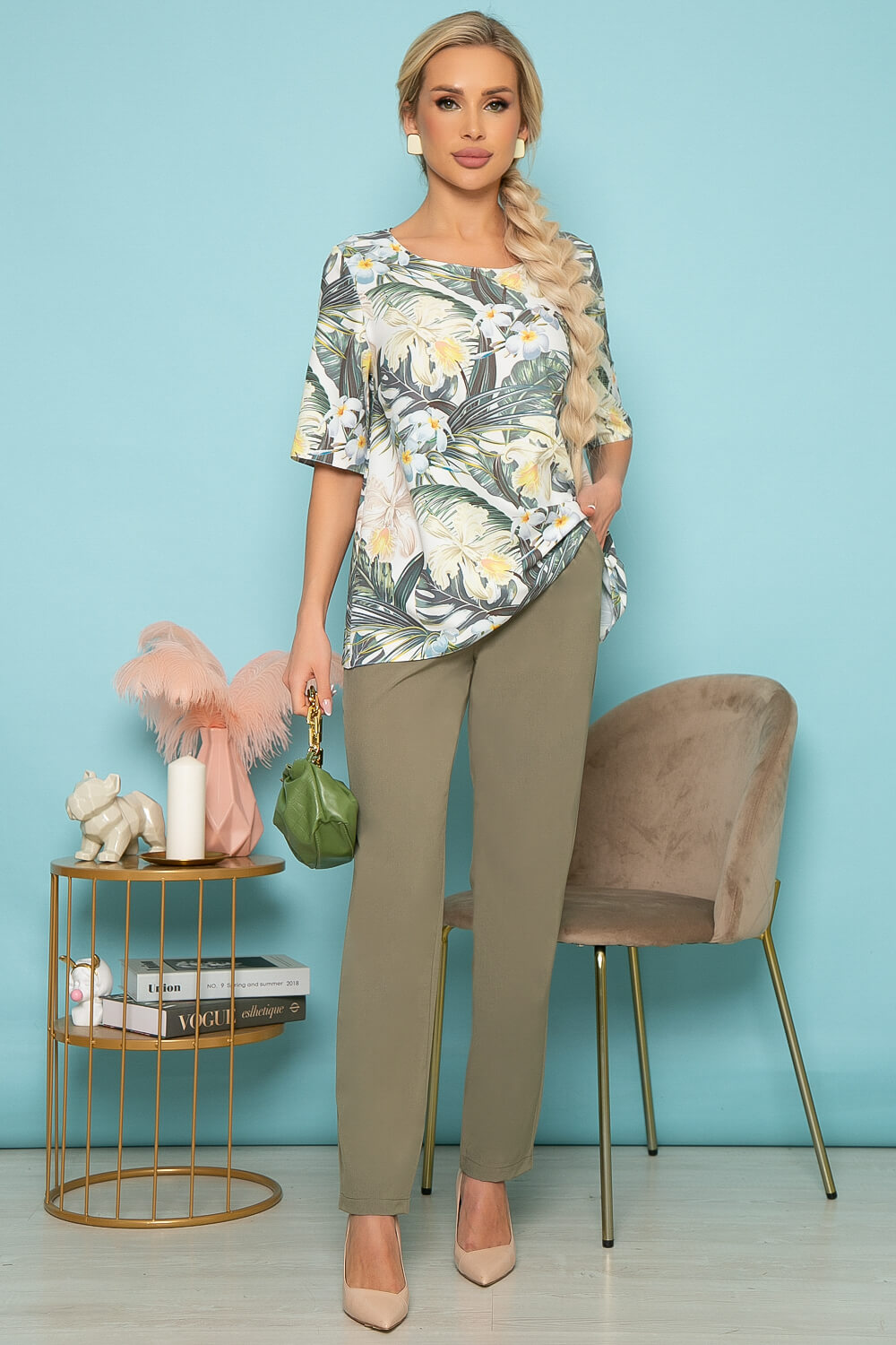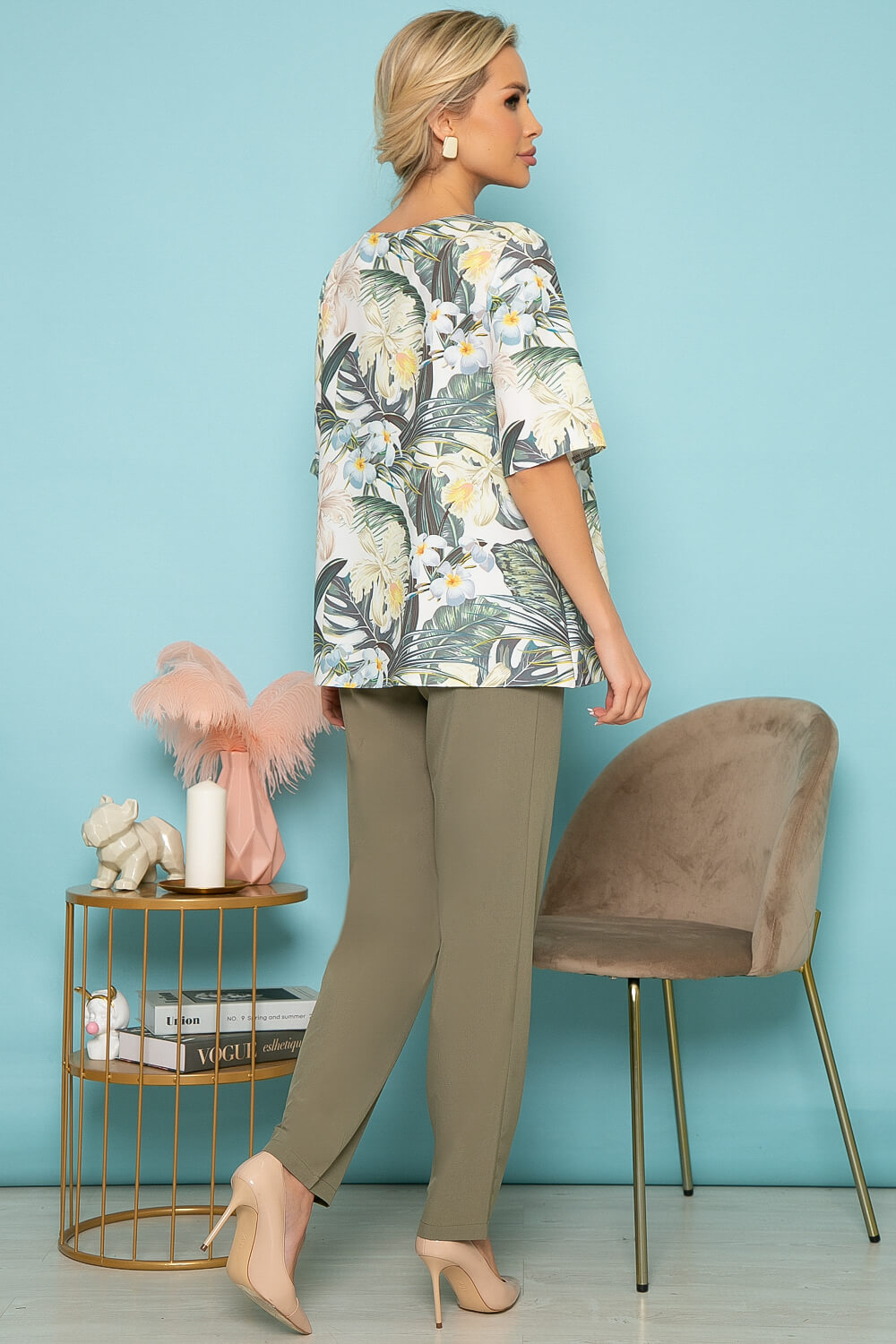 Брючный костюм, состоящий из блузы свободного кроя и брюк.