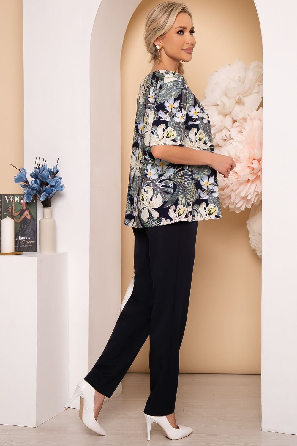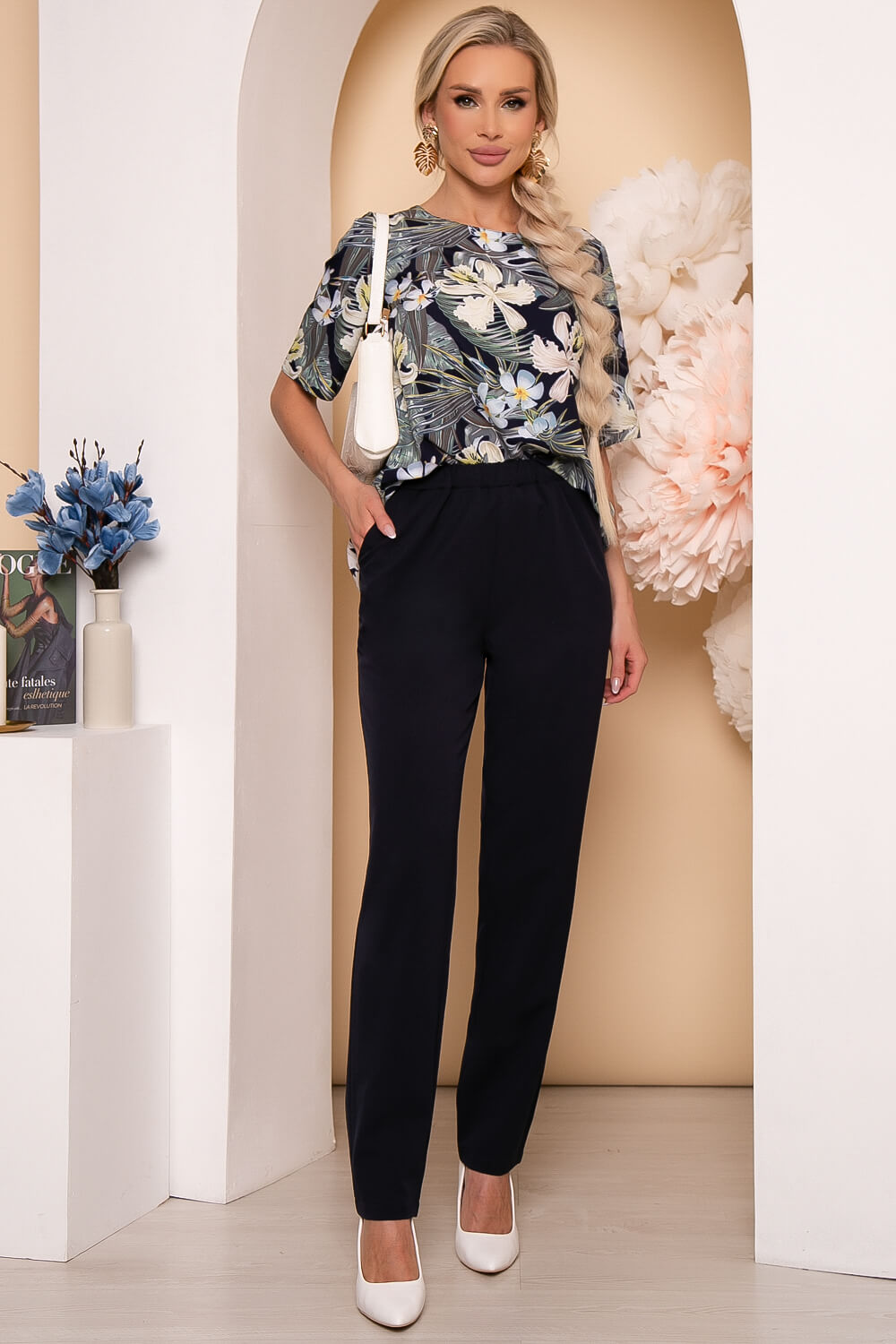 Брючный костюм, состоящий из блузы свободного кроя и брюк.
