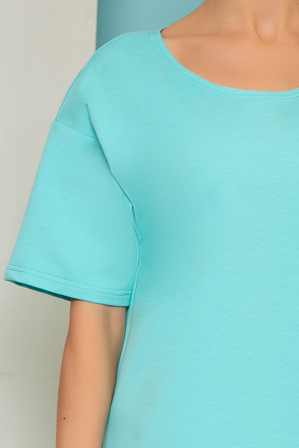 Костюм с шортами из футера - универсальная модель на лето. Шорты на резинке, в боковых швах есть карманы. По низу отвороты. Футболка в стиле оверсайз, крой прямой, линия плеча спущена, по бокам разрезы, по спинке есть небольшое удлинение.