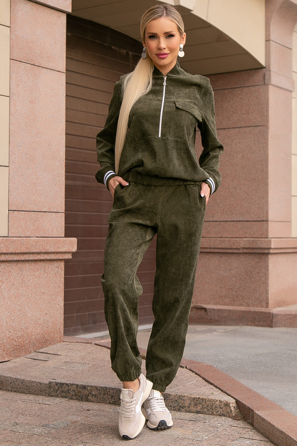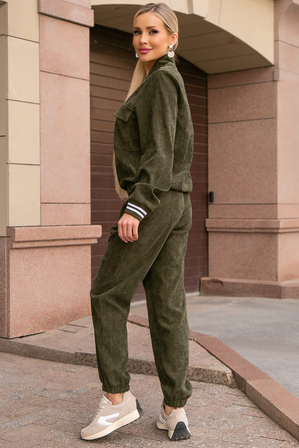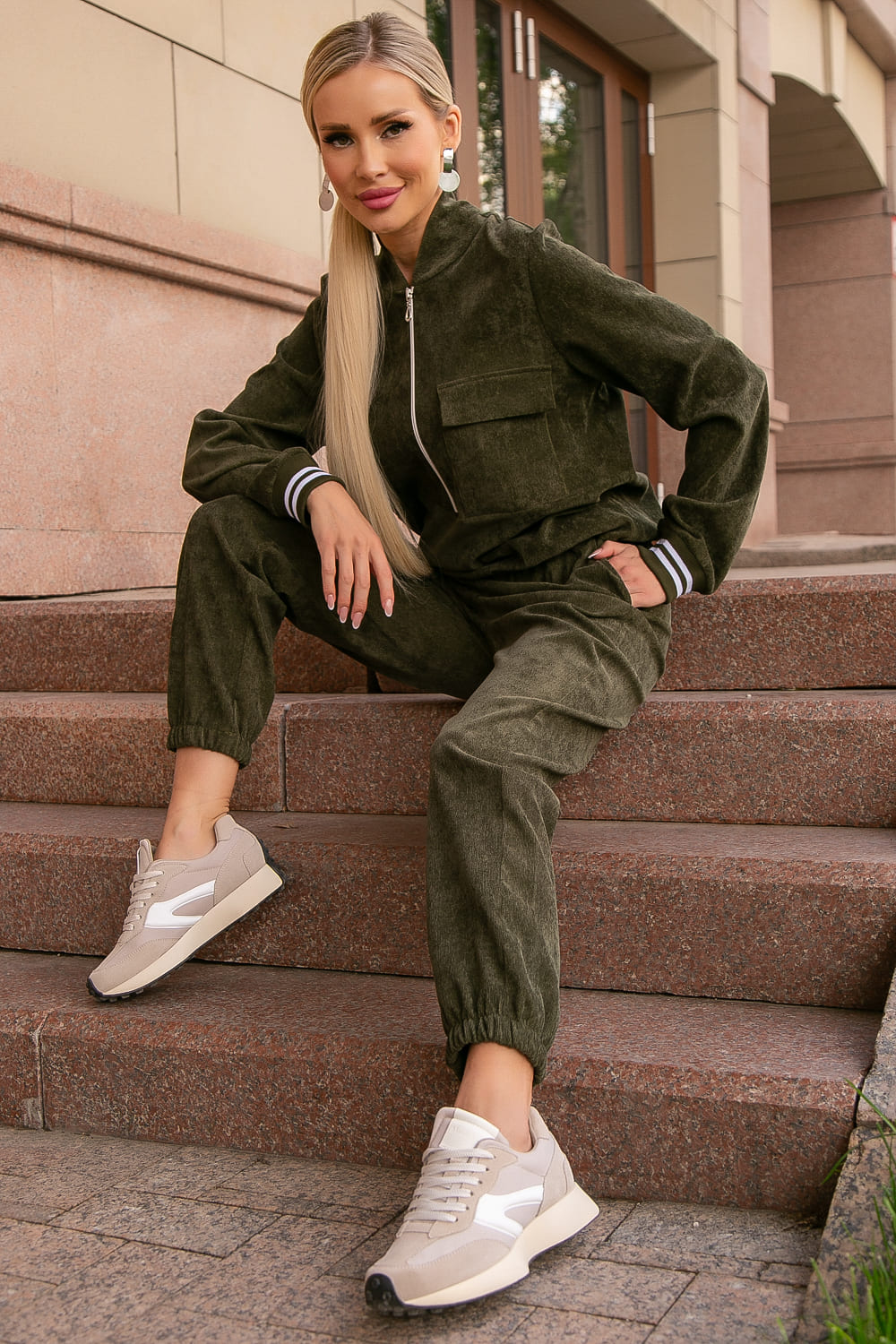Стильный комплект станет Вашей любой вещью в гардеробе! Костюм из двух предметов, комфортных джоггеров и крутого бомбера. Бомбер резной ниже груди, на молнии, с воротником стойкой. Слева на груди карман с клапаном, по низу рукава стильные тканевые манжеты, низ на резинке. Джоггеры с высокой посадкой, талия на широкой резинке, брюки на резинке. В боковых швах карманы.