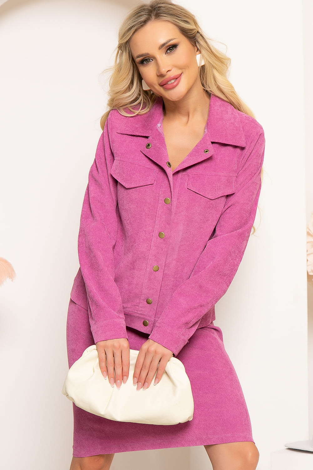 Костюм из микровельвета в оттенке "розовая орхидея" - базовый комплект с изюминкой. Роскошно будет смотреться, как в монохромном образе, так и с яркими акцентами. Костюм состоит из юбки прямого кроя и жакета. Юбка на притачном поясе, с резинкой, по спинке застёгивается на потайную молнию. Сзади юбки разрез. Жакет по переду застёгивается на кнопки. Рукав длинный, втачной, на манжете. Манжеты также застёгиваются на кнопку. По груди имитация карманов с клапанами. Жакет выполнен на притачном поясе.