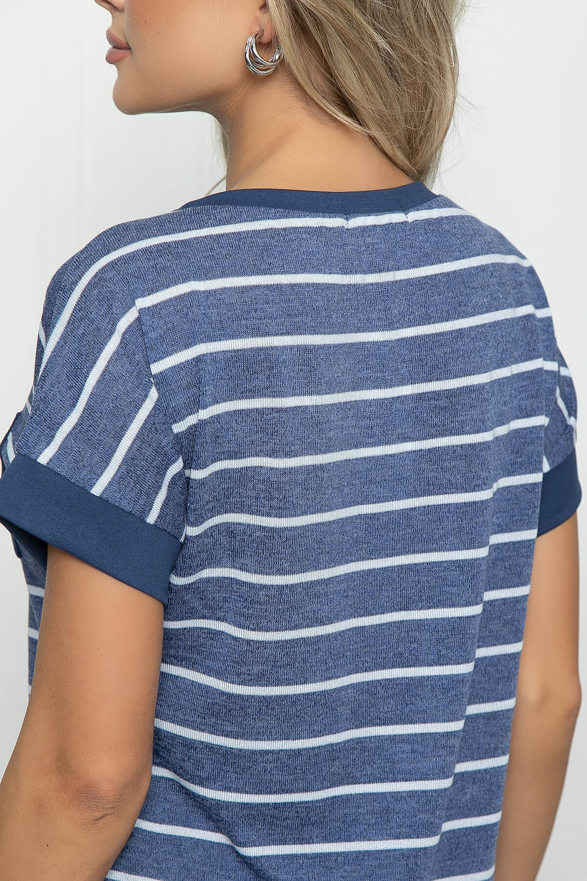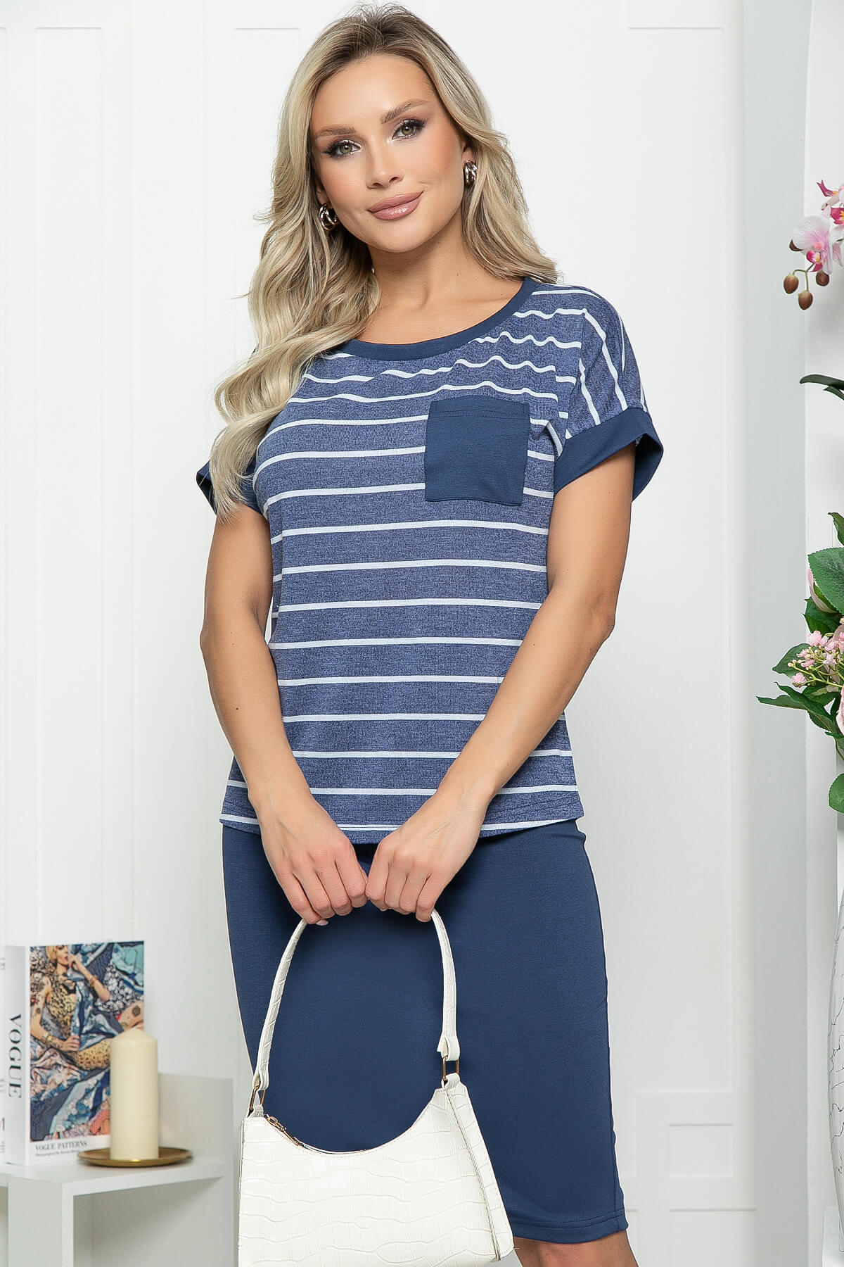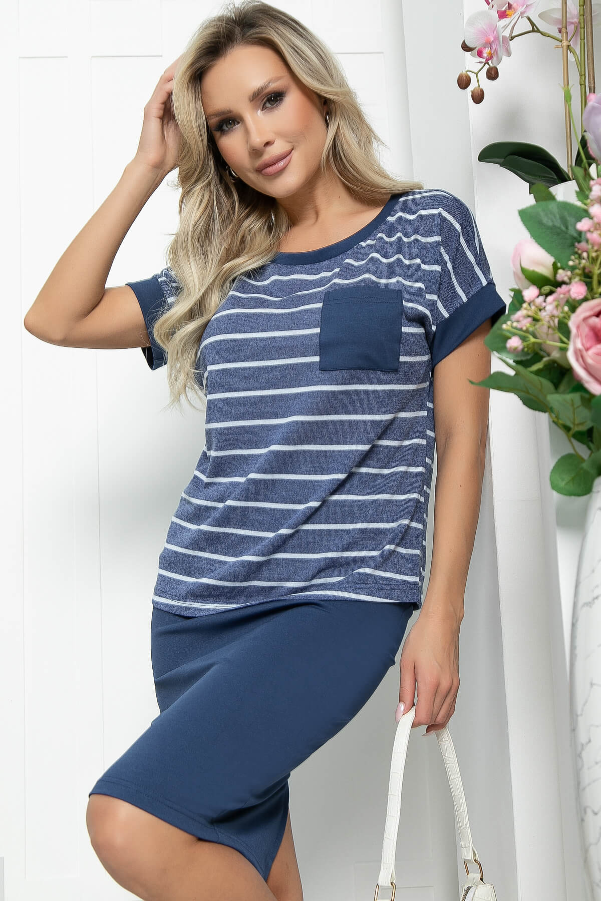 Костюм на каждый день, состоящий из двух предметов: юбки и футболки свободного кроя. Юбка, манжеты блузы и кармашек выполнены из однотонного трикотажа синего цвета. Универсальная футболка идеально будет сочетаться так же с брюками и джинсами.