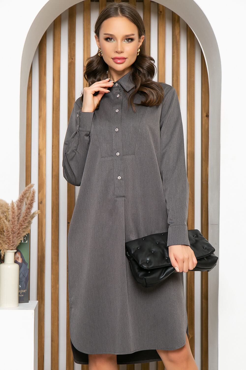 Стильное платье-рубашка тёмно-серого цвета неприхотливо в уходе и выборе аксессуаров, но при этом является самодостаточным элементом образа. Платье классического рубашечного покроя. Отложной воротник, рукав втачной, длинный, на манжете. Платье застегивается на пуговицы по переду. По бокам юбки разрезы.