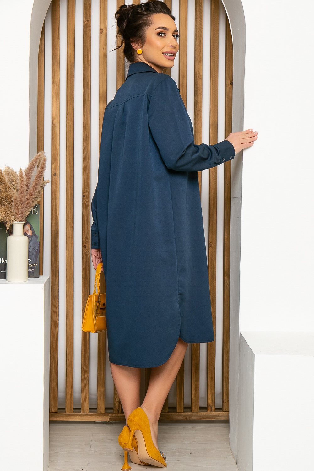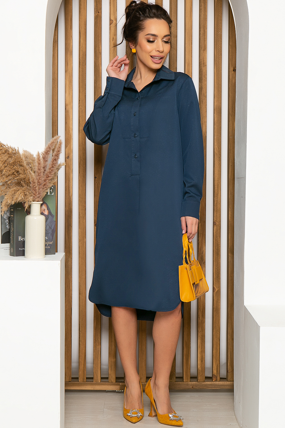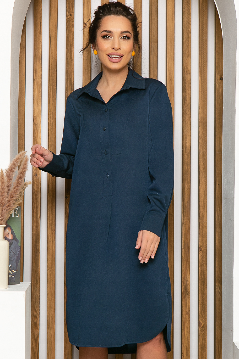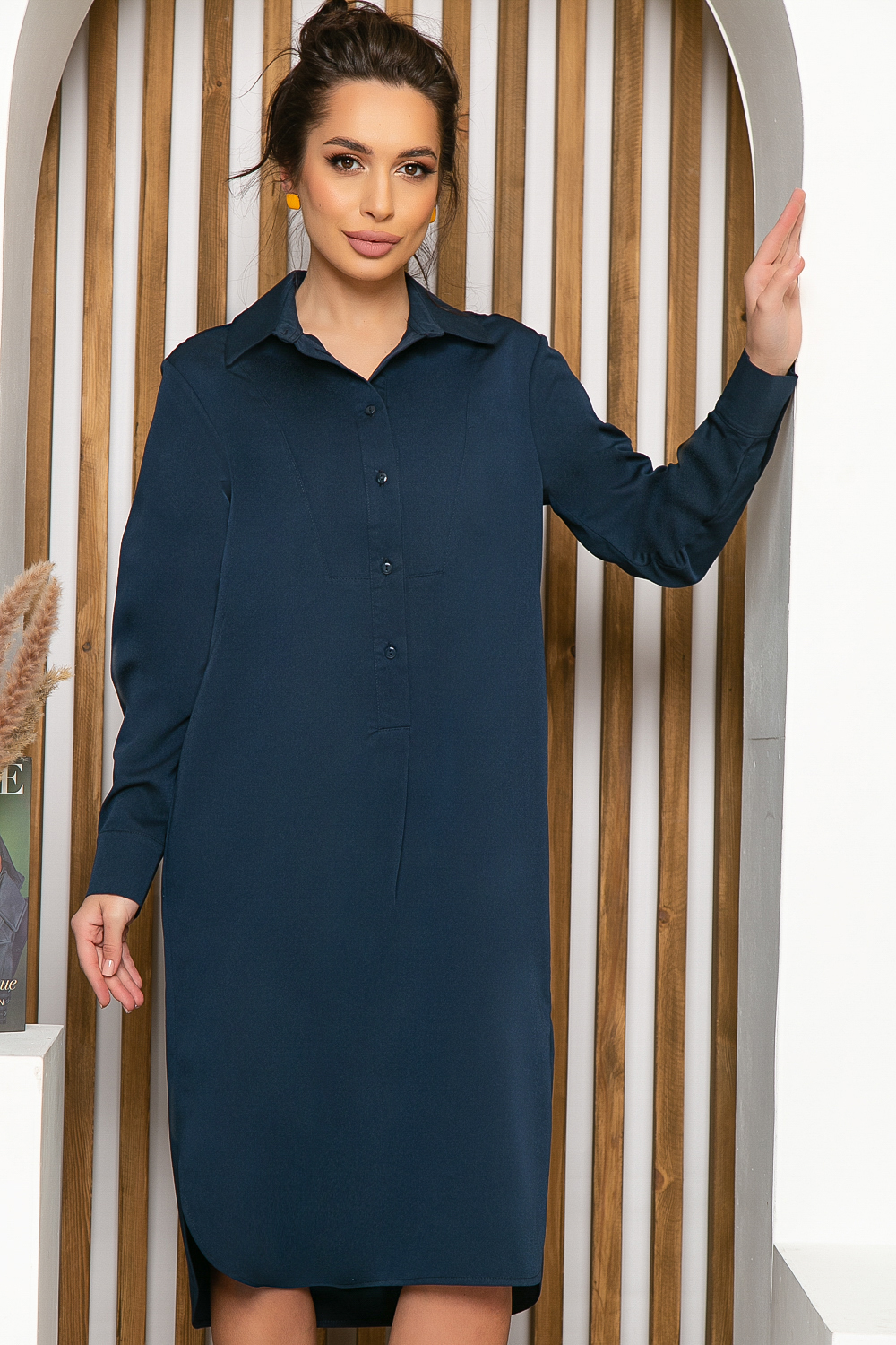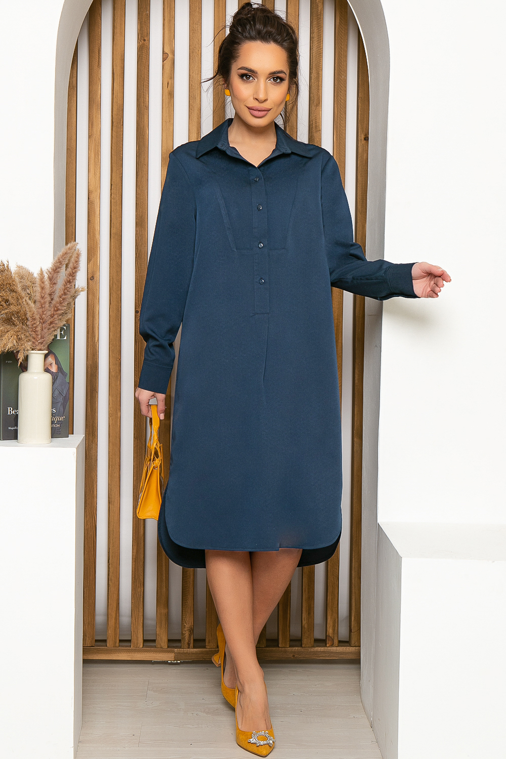 Стильное платье-рубашка в глубоком синем цвете. Оно неприхотливо в уходе и выборе аксессуаров, но при этом является самодостаточным элементом образа. Платье классического рубашечного покроя. Отложной воротник, рукав втачной, длинный, на манжете. Платье застегивается на пуговицы по переду. По бокам юбки разрезы.