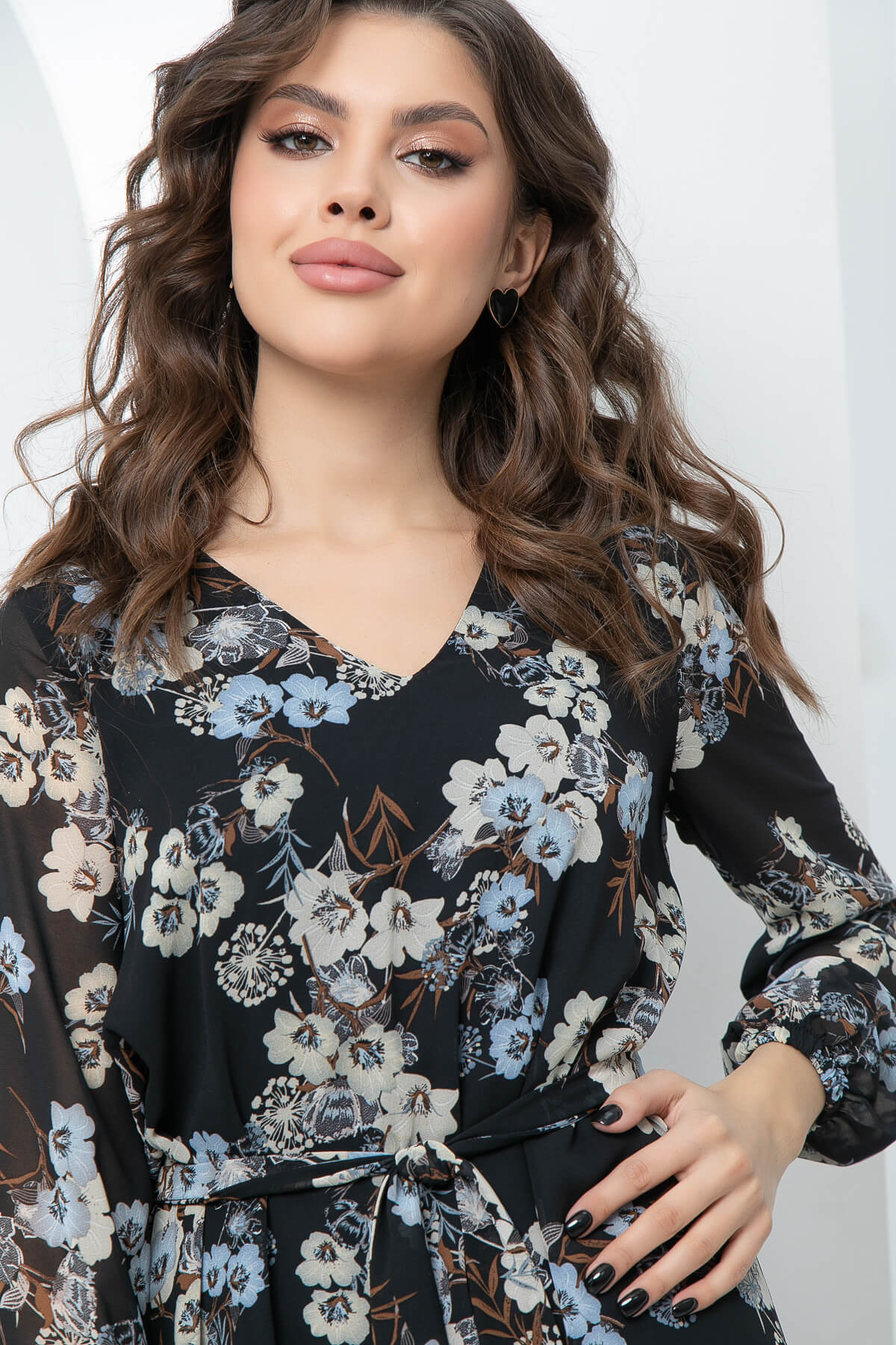 Шифоновое летящее платье идеально подчёркивающее Вашу женственность. Платье свободного силуэта на подкладке. Мягкий V-образный вырез горловины красиво открывает зону декольте и Ваши ключицы. Длинный, втачной рукав, низ на резинке. Пояс из основной ткани входит в комплект.