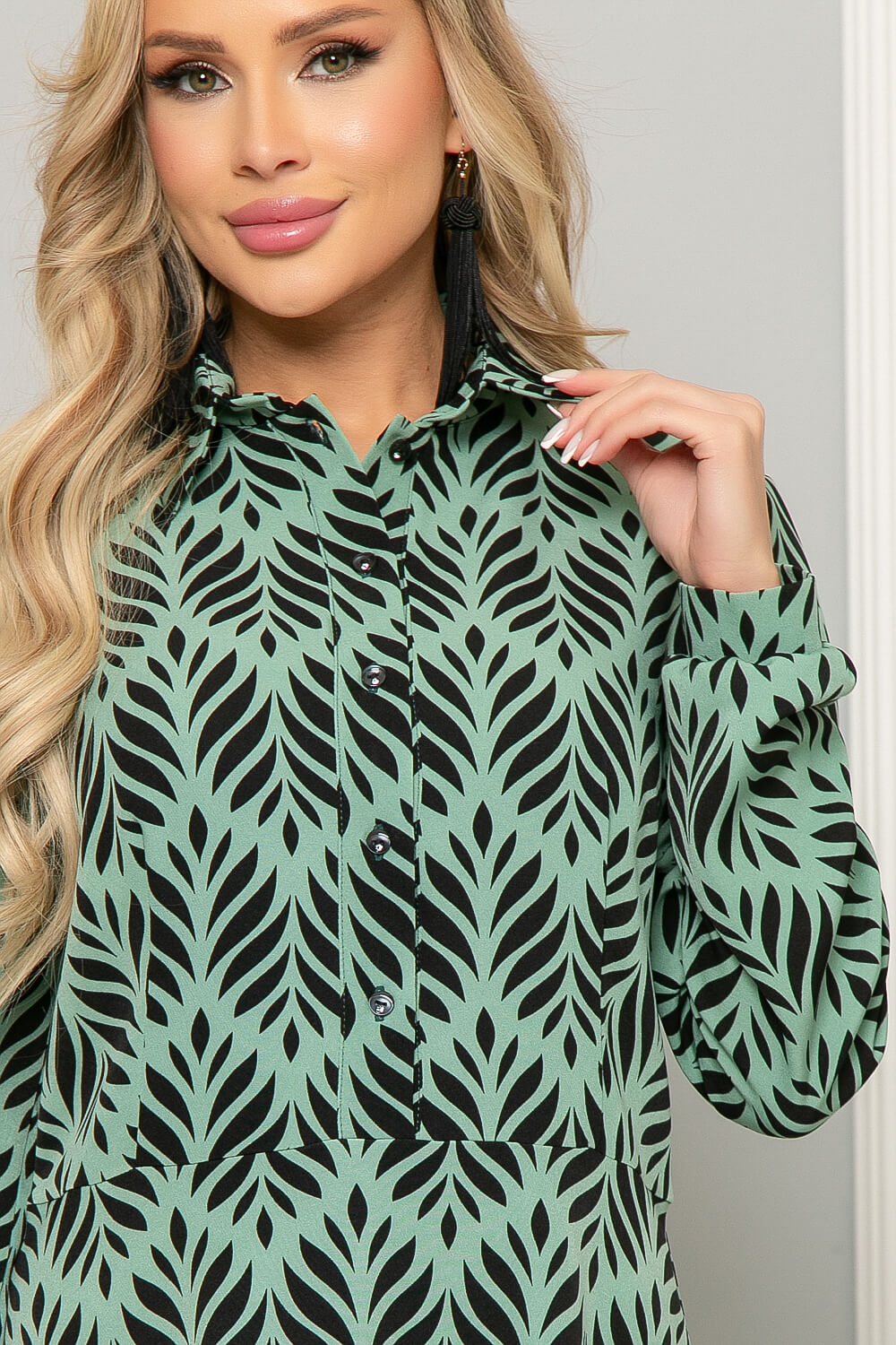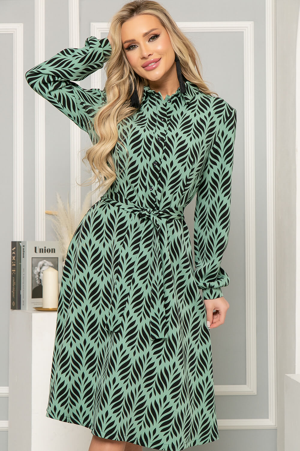 Платье женственного кроя средней длины с летящей юбкой. Гармоничная длина платья позволяет сочетать его с разнообразными вариантами обуви от туфель-лодочек до сапог с высоким голенищем. Принт на ткани побуждает экспериментировать. Отличный шанс разнообразить гардероб! Пояс из основной ткани входит в комплект. Рукав втачной длинный, на манжете. По переду платье застёгивается на пуговицы, отрезное по линии талии.