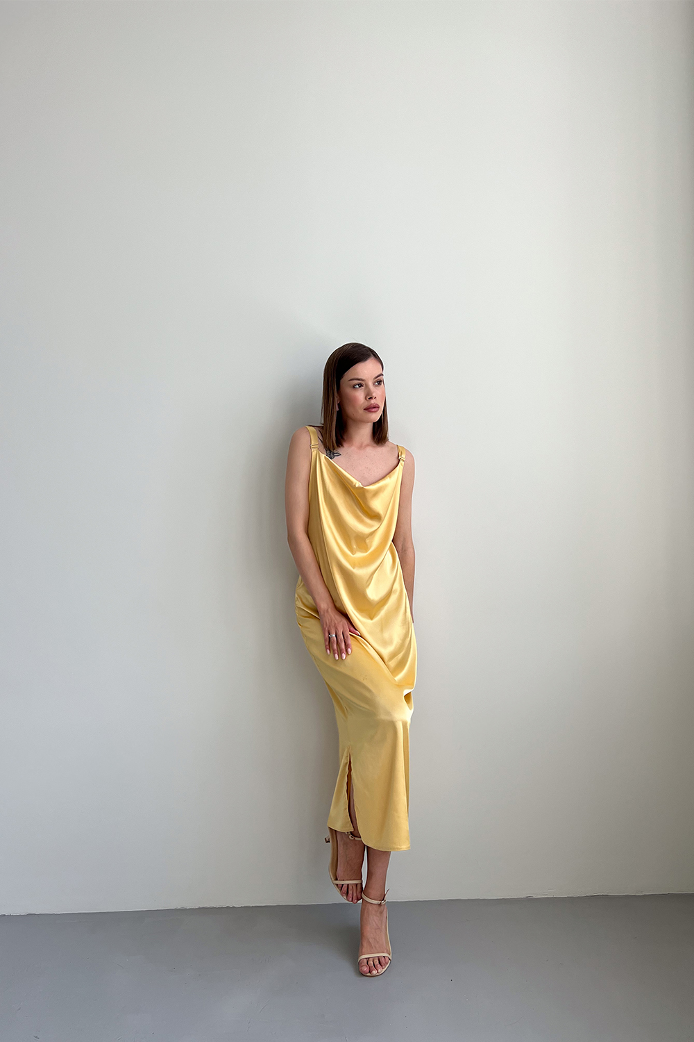 Платье-комбинация - яркий элемент богемного стиля. Такая модель платья является универсальной, ведь дополняя её разнообразными элементами одежды, можно получить образ на разные случаи: для прогулки, на вечеринку или для похода в театр. Платье прямого кроя. По бокам разрезы. Бретели регулируются.