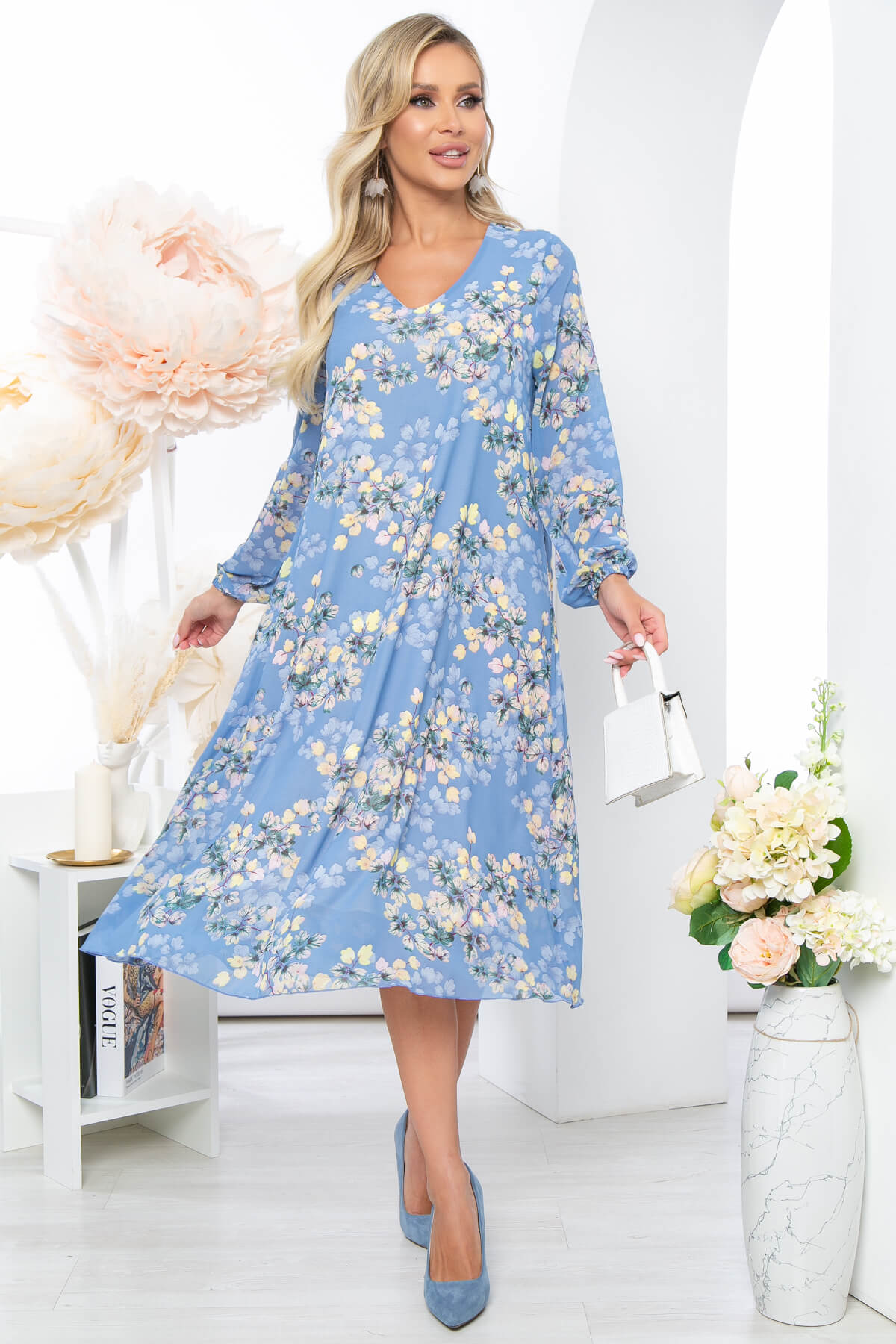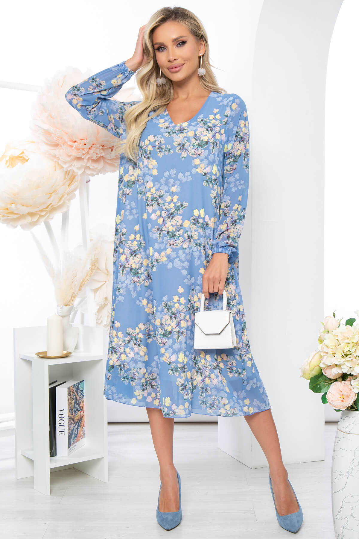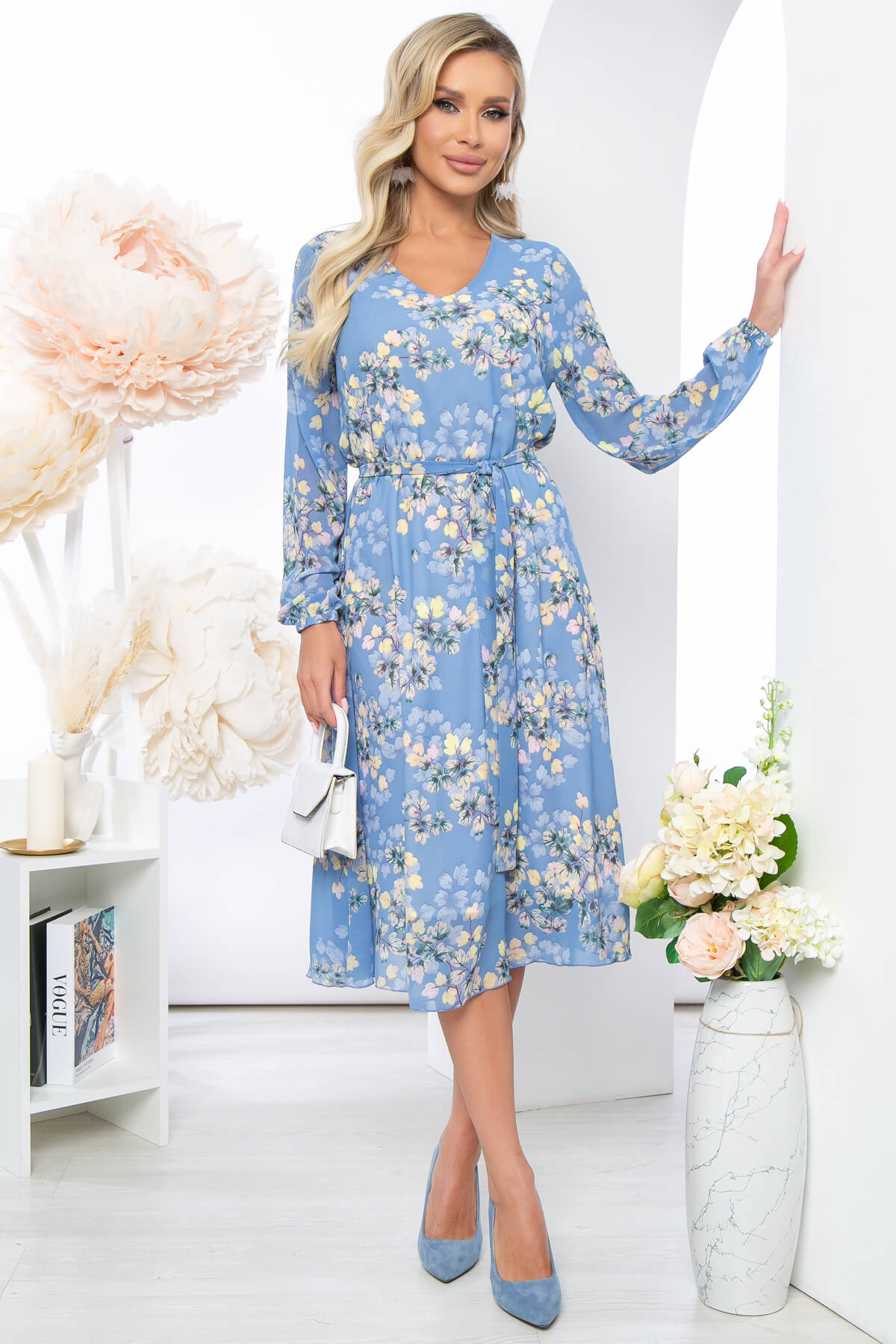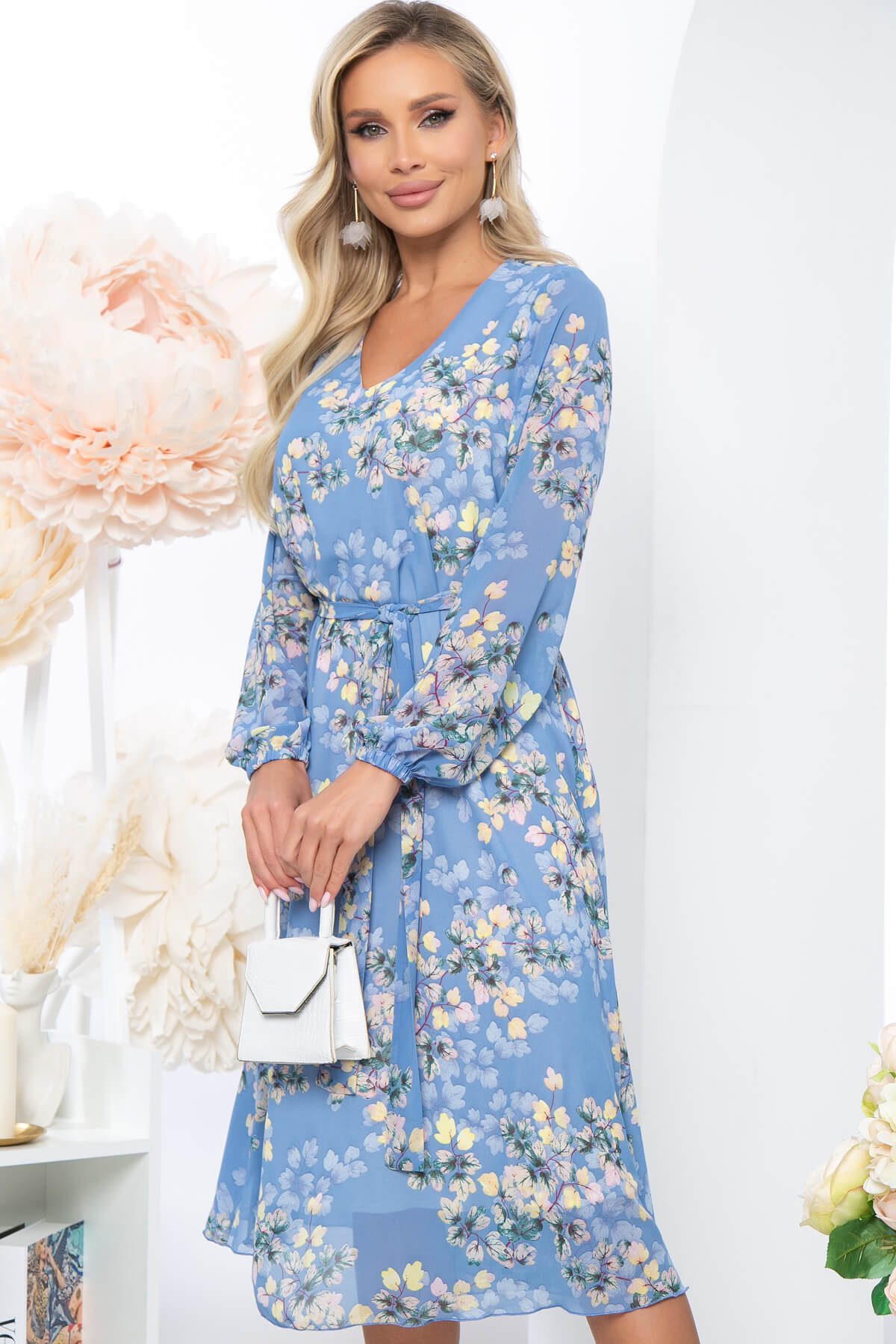 Шифоновое летящее платье идеально подчёркивающее Вашу женственность. Платье свободного силуэта на подкладке. Мягкий V-образный вырез горловины красиво открывает зону декольте и Ваши ключицы. Длинный, втачной рукав, низ на резинке. Пояс из основной ткани входит в комплект.