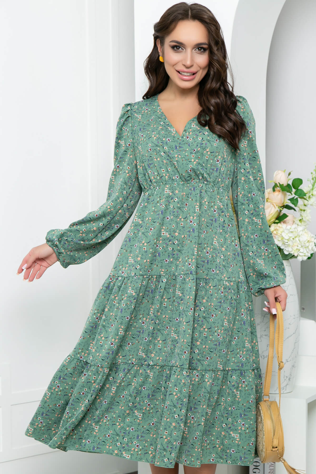 Невероятное платье для создания утончённого женственного образа. Красиво скроенный верх подчеркнёт зону декольте. За счёт своего кроя позволит подчеркнуть линию талии. Эффектное и удобное платье, которое подойдет для любого случая. Талия на резинке, длина юбки каскадно украшена красивыми, широкими волнами. Рукав длинный, внизу собран на резинку.