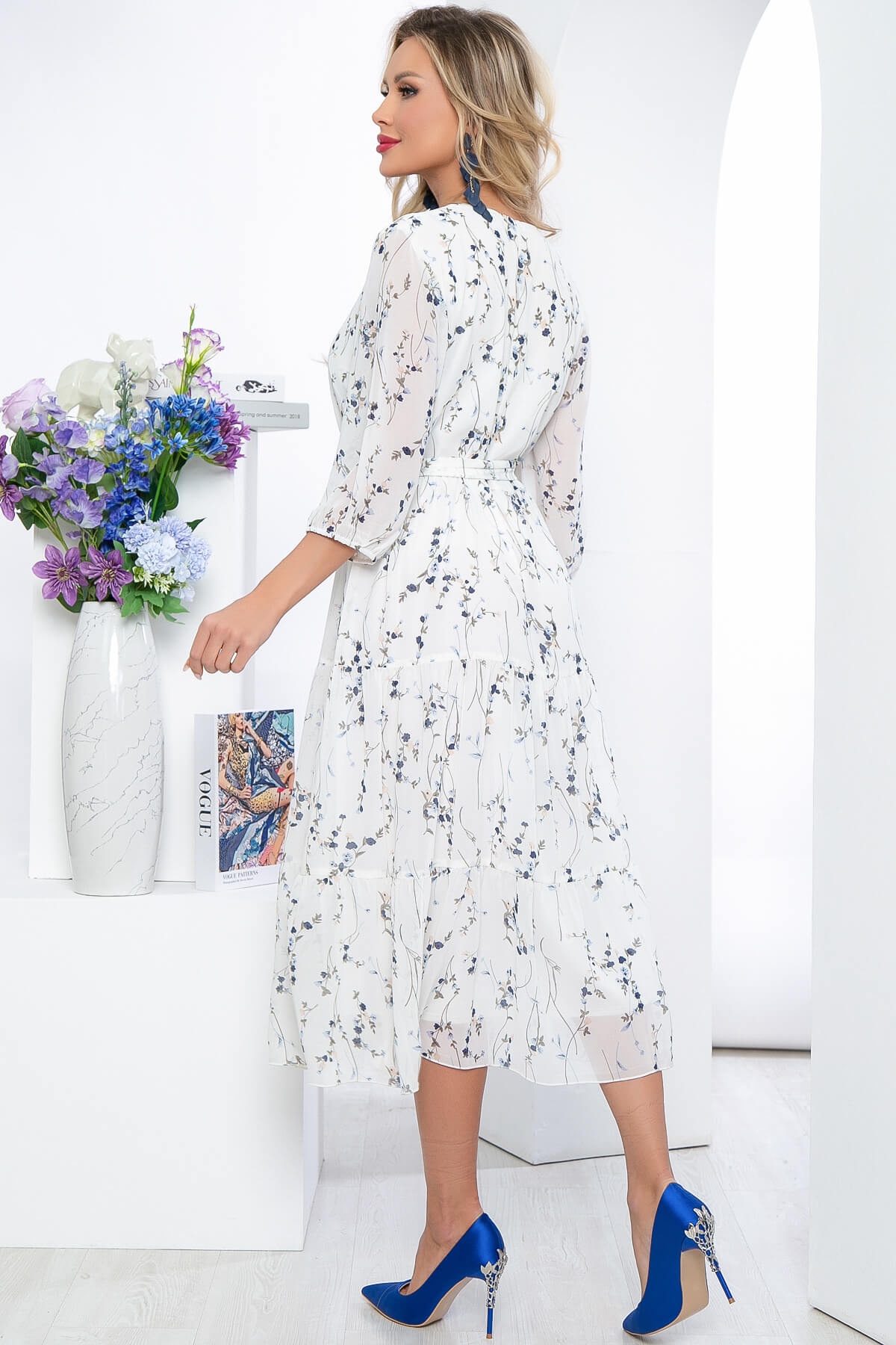 Платье из шифона с цветочным принтом украсит ваш нарядный образ и создаст прекрасное настроение. Белый цвет платья добавит привлекательности. Нежная и струящаяся фактура ткани выгодно подчеркнут достоинства фигуры, а пояс из основной ткани сделает акцент на талии.