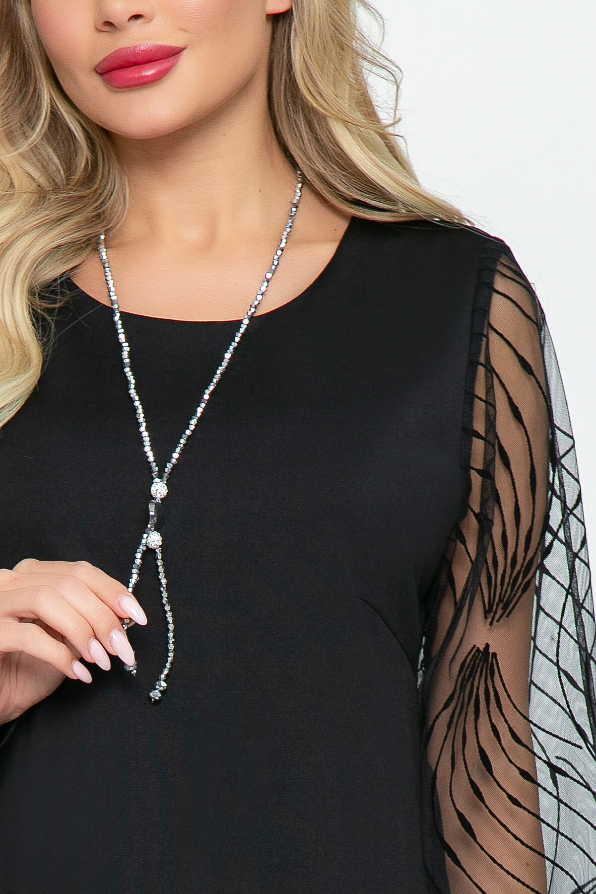 Элегантное платье не оставит вас без внимания окружающих. Объемные рукава на манжете добавят образу привлекательности. Низ платья украшен полупрозрачной вставкой из сетки. Данный элемент добавит игривые ноты образу.