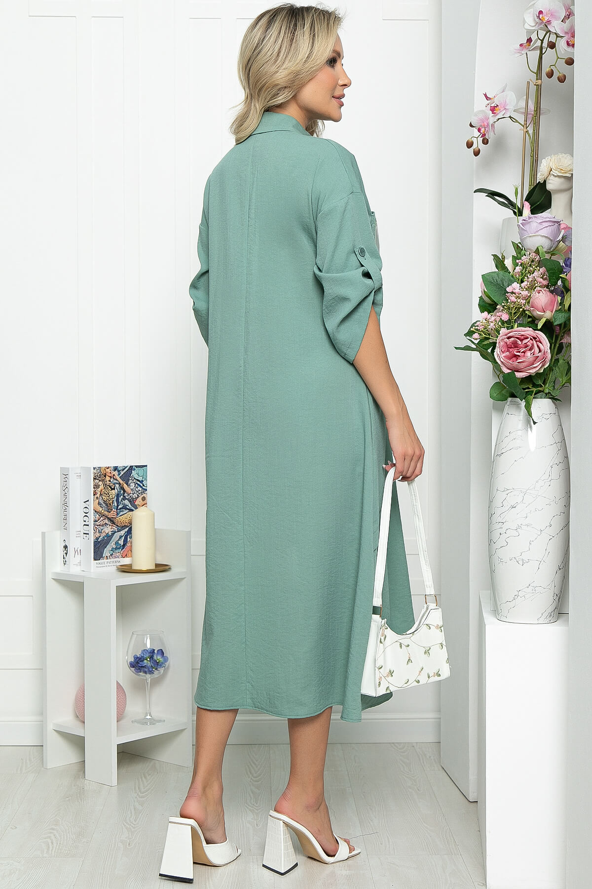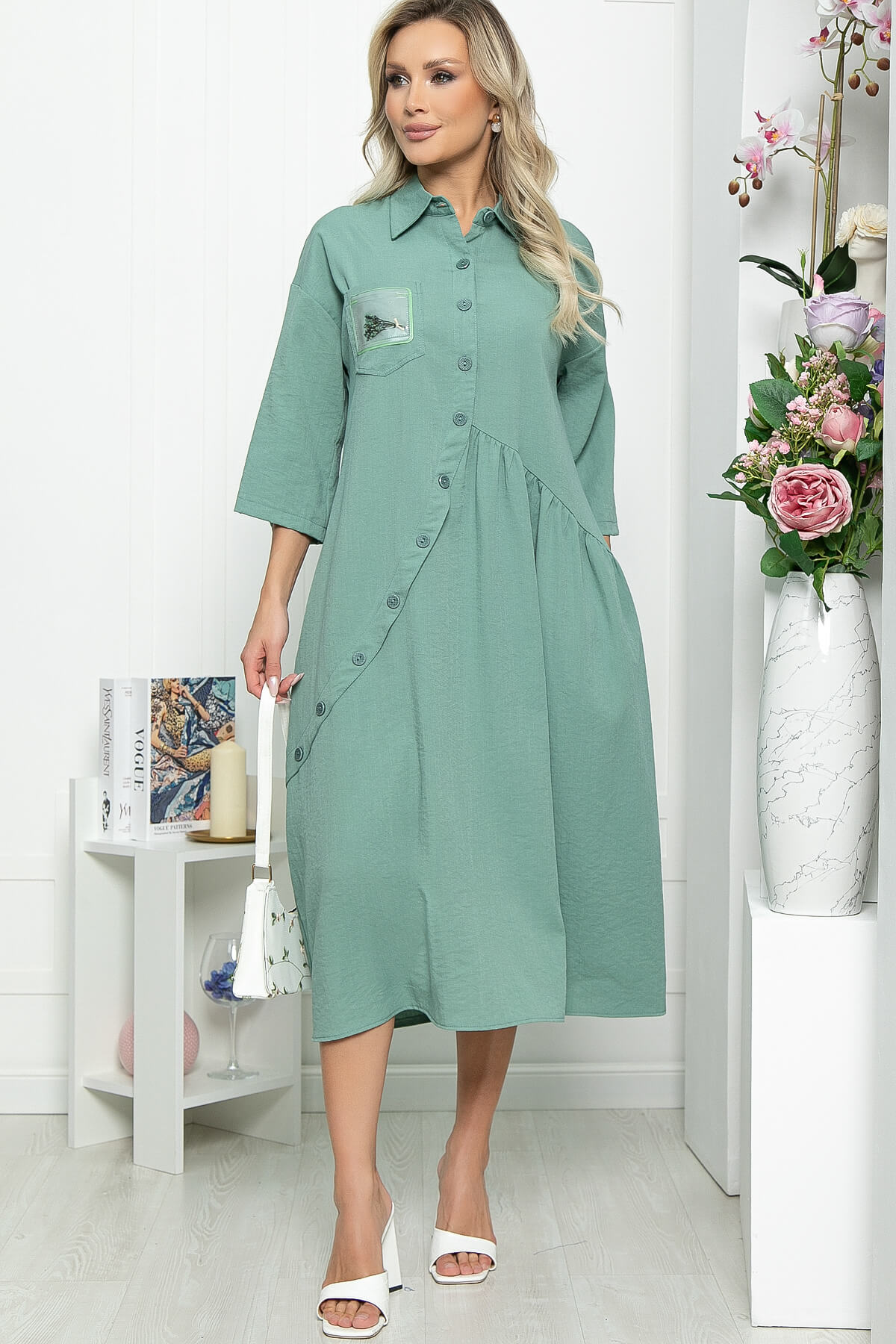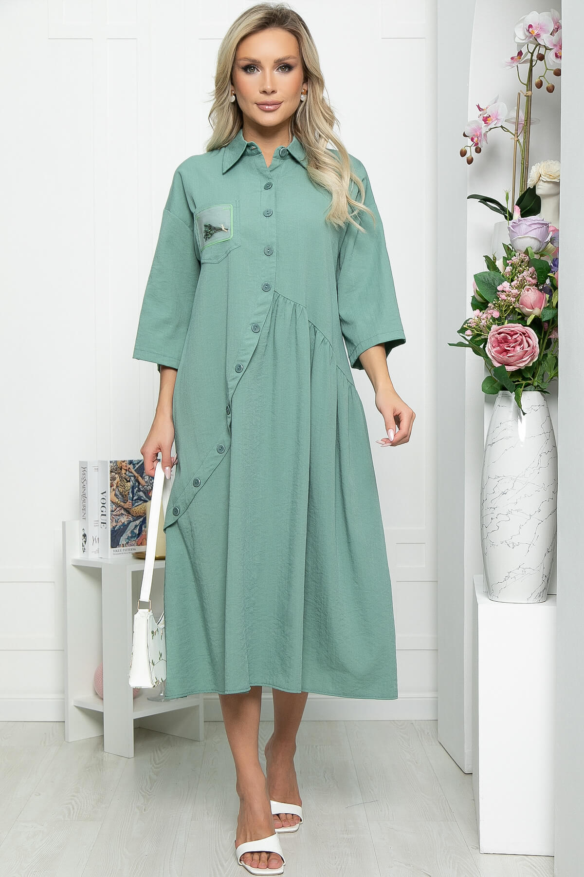 Стильное платье придаст Вам привлекательности, при этом образ получится достаточно сдержанным и комфортным. Платье будет отлично смотреться даже без аксессуаров, украшает образ карман с декором. Рукав втачной со спущенным плечевым швом, длина - три четверти, подворачивается на пату. Функциональные пуговицы только в верхней части платья, по юбке присутствует имитация застежки.