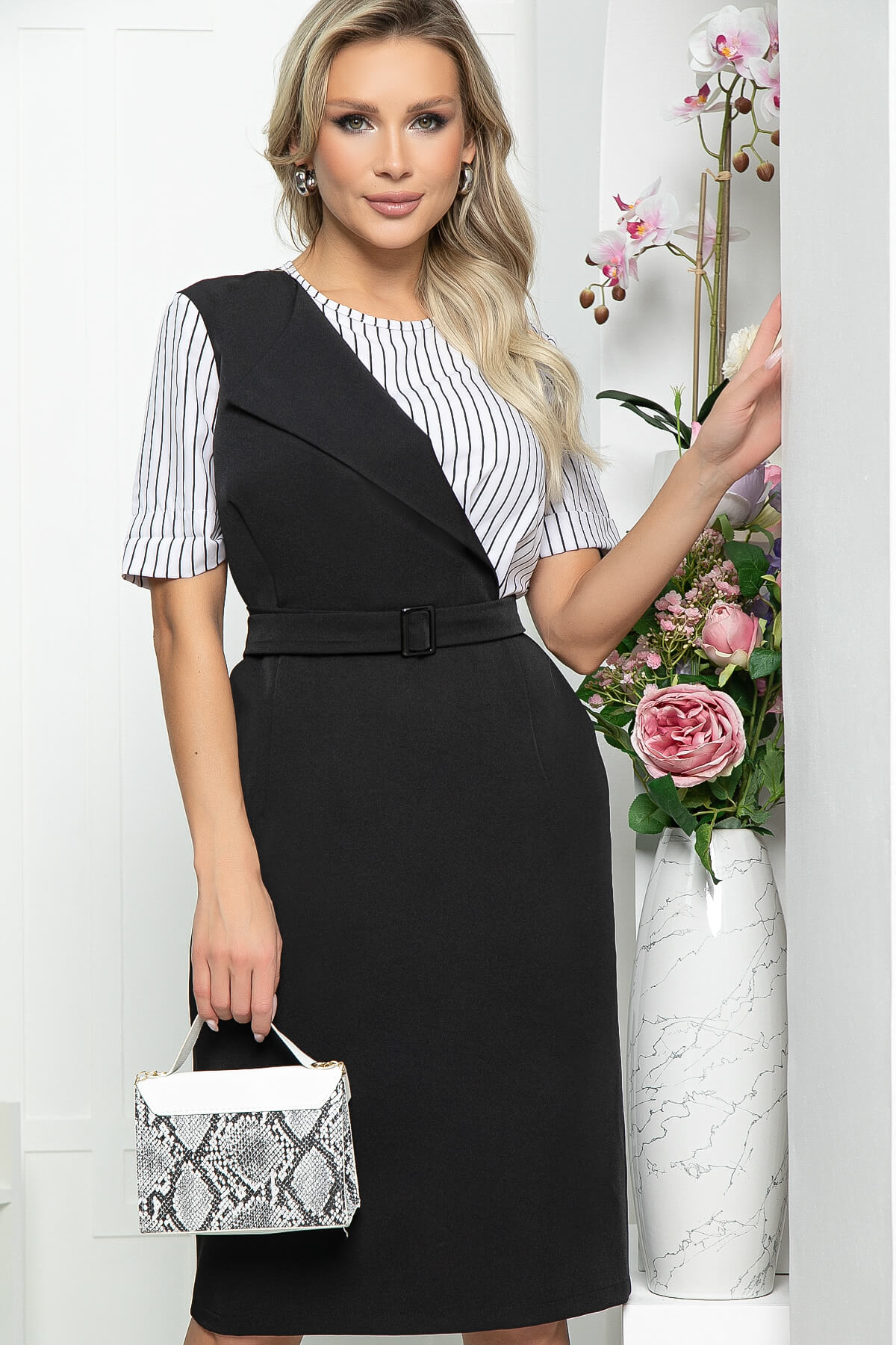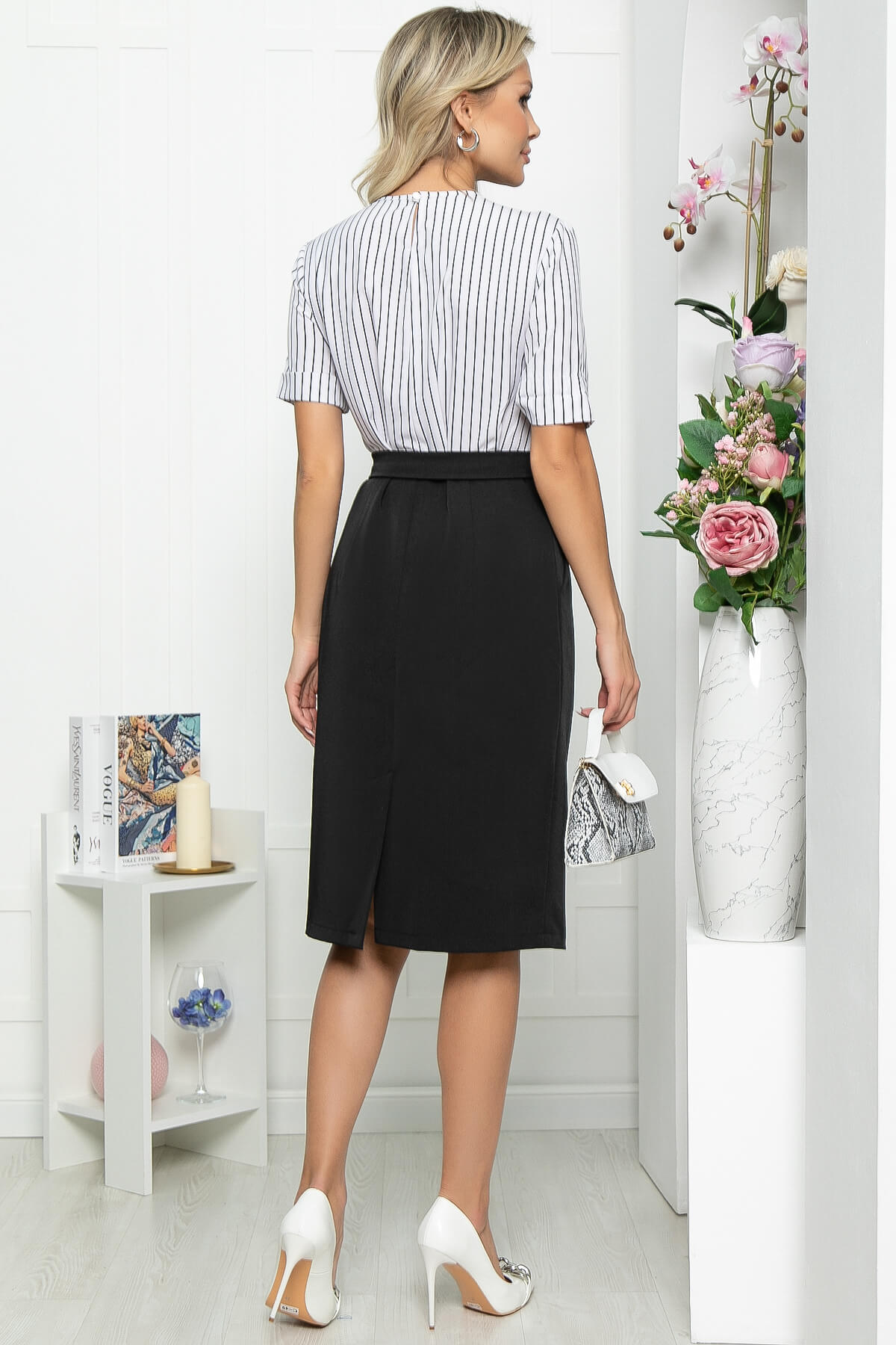 Платье с ассиметричным верхом в классическом стиле идеально разнообразит Ваш офисный образ. Платье выполнено из комбинированных материалов приятных к телу. Верхняя часть выполнена с имитацией блузы с коротким втачным рукавом. Округлый вырез горловины, по спинке застегивается на застёжку "петля-пуговица". В боковом шве есть потайная молния. Платье приталенного силуэта, в боковых швах расположены карманы, сзади на юбке шлица. В комплекте пояс с пластиковой пряжкой.