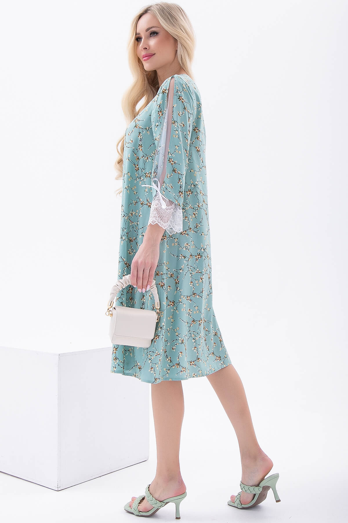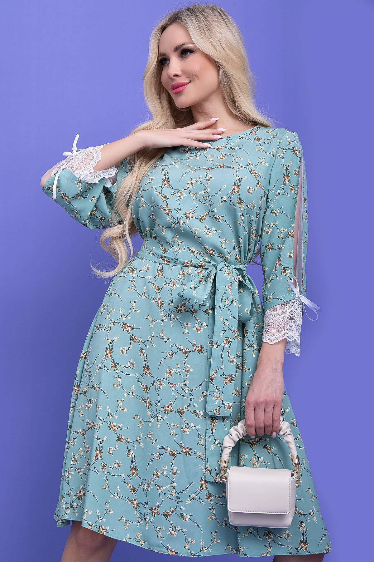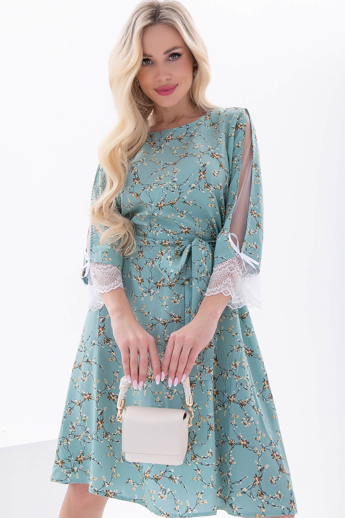 Платье, наполненное всеми атрибутами женственности. Лёгкое, струящееся платье подойдёт для любого типа фигуры за счет свободного кроя. При помощи пояса, входящего в комплект, можно подчеркнуть линию талии. Вырез горловины - округлый. Рукав втачной, три четверти, украшен сеткой с кружевом по нижнему краю и атласными лентами.