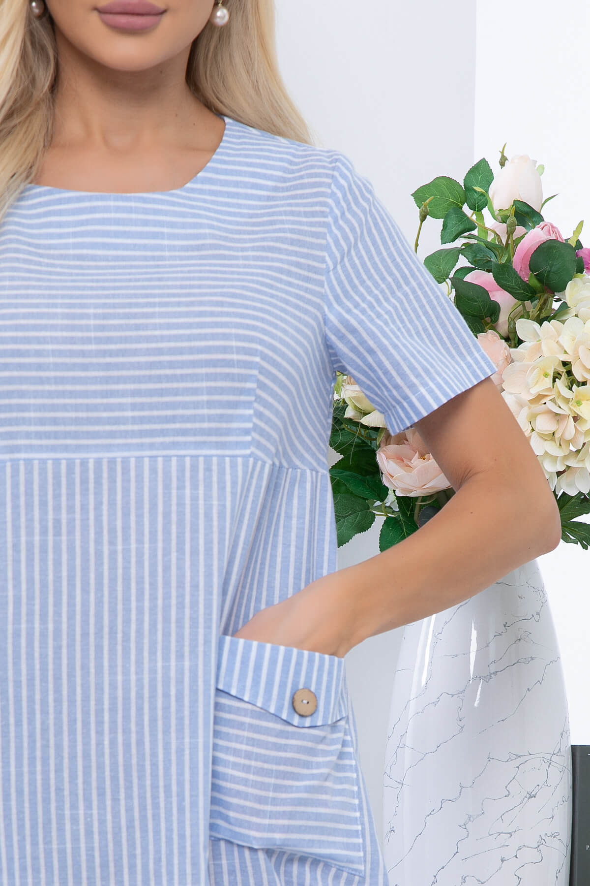 Стильное платье придаст Вам привлекательности, при этом образ получится достаточно сдержанным и комфортным. Рукав укороченный, втачной. Изделие украшают накладные карманы, декорированные пуговицей.