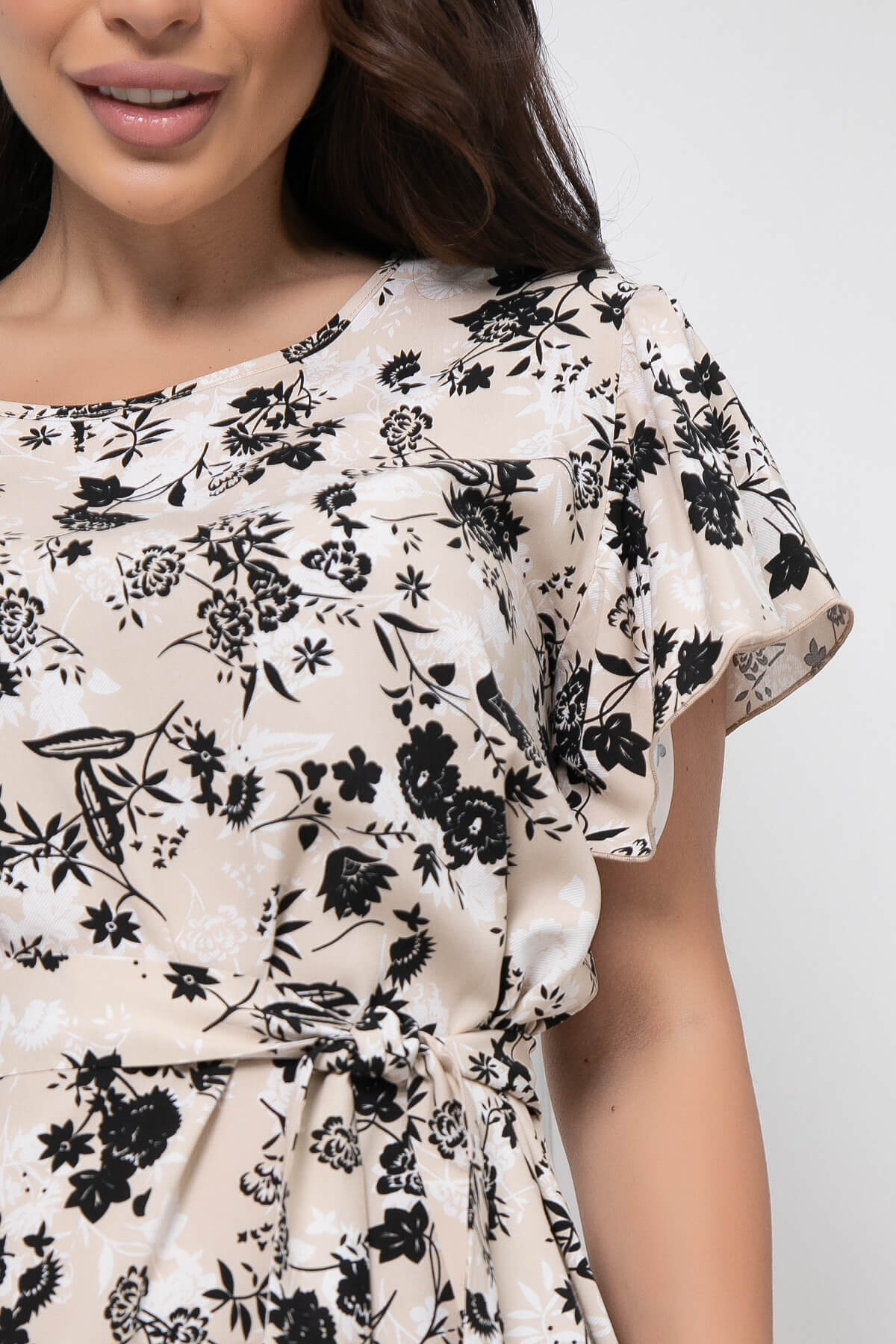Невесомое платье из хлопковой ткани прекрасно подходит для создания нежного женственного образа. Низ платья украшает широкий волан, который выступает дополнением к летящим рукавам. В комплект входит пояс из основной ткани.