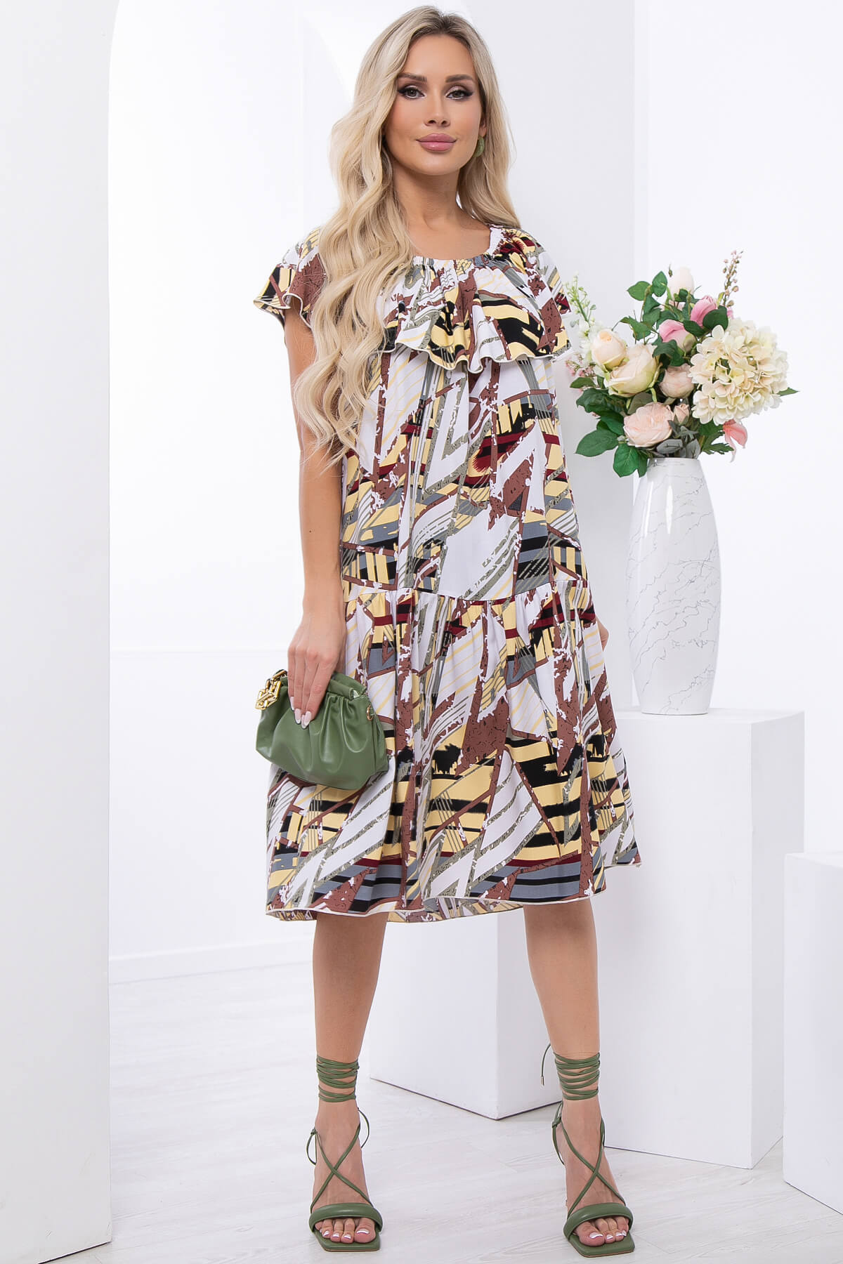 Платье свободного кроя изумительно смотрится как с каблучком, так и с кедами! Юбка с воланом по низу добавляет романтичности и воздушности образу. Изделие украшает акцентный рукав и вырез, позволяющий открыть одну из самых женственных частей тела - плечи и ключицу.