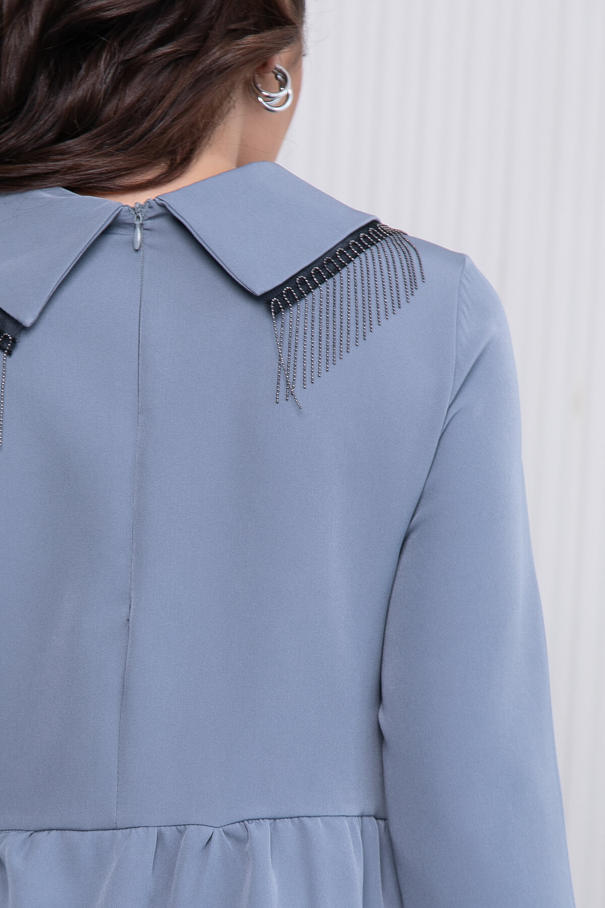 Женственное платье поможет в создании красивого делового образа. Украшением платья служит пышная юбка и отложной ворот, декорированный металлической бахромой. Платье ярусное, талия отрезная.