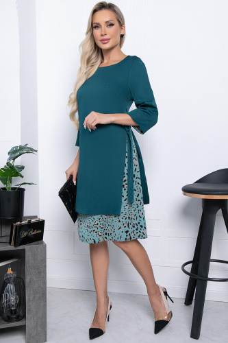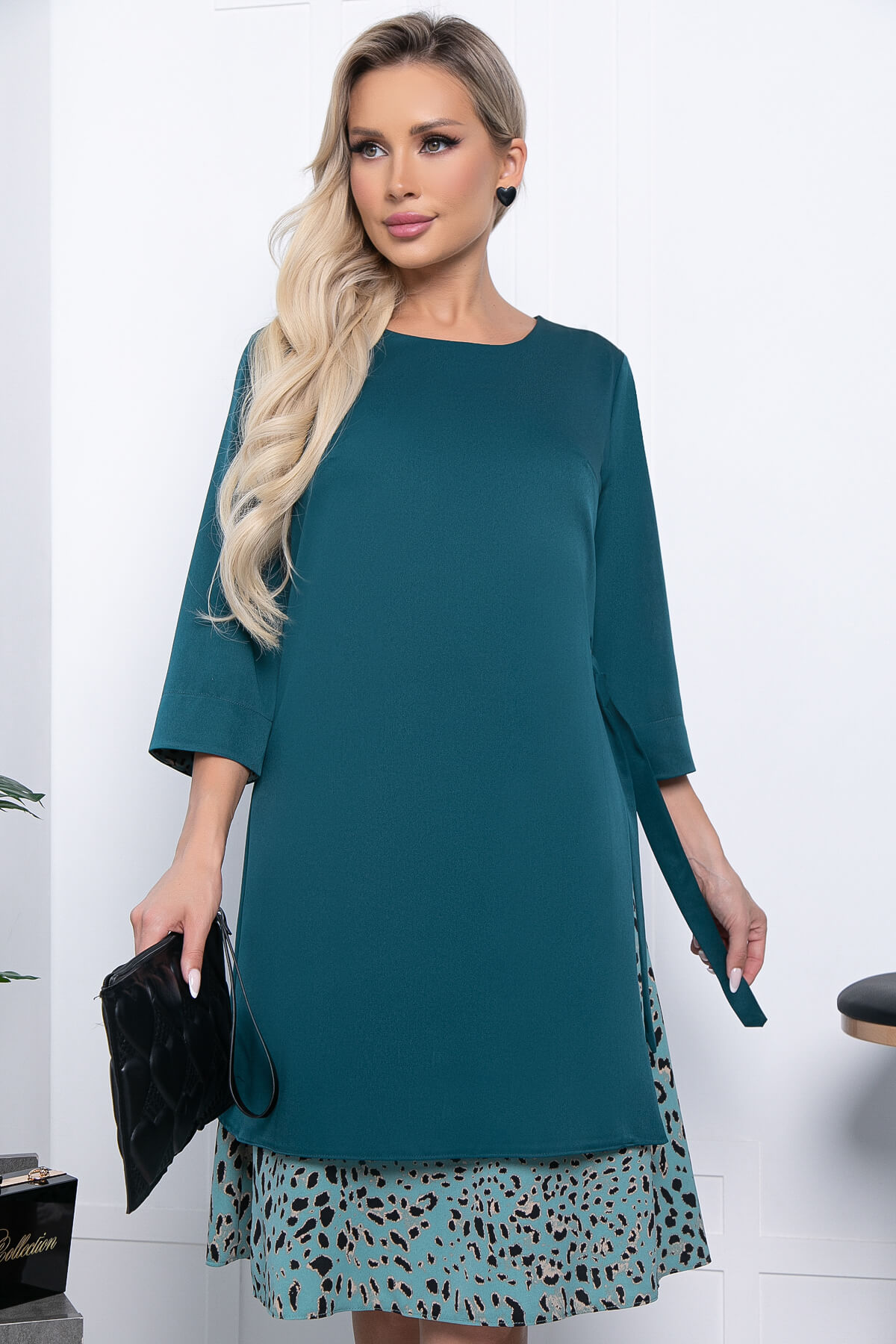 Платье А-силуэта свободного кроя создано из двух типов ткани: костюмной и плательной. За счёт сочетания плотной и более лёгкой ткани создается эффект многослойности образа. По боку костюмная ткань имеет разрез, декорированный крупным люверсом. Платье по боку завязывается на пояс.