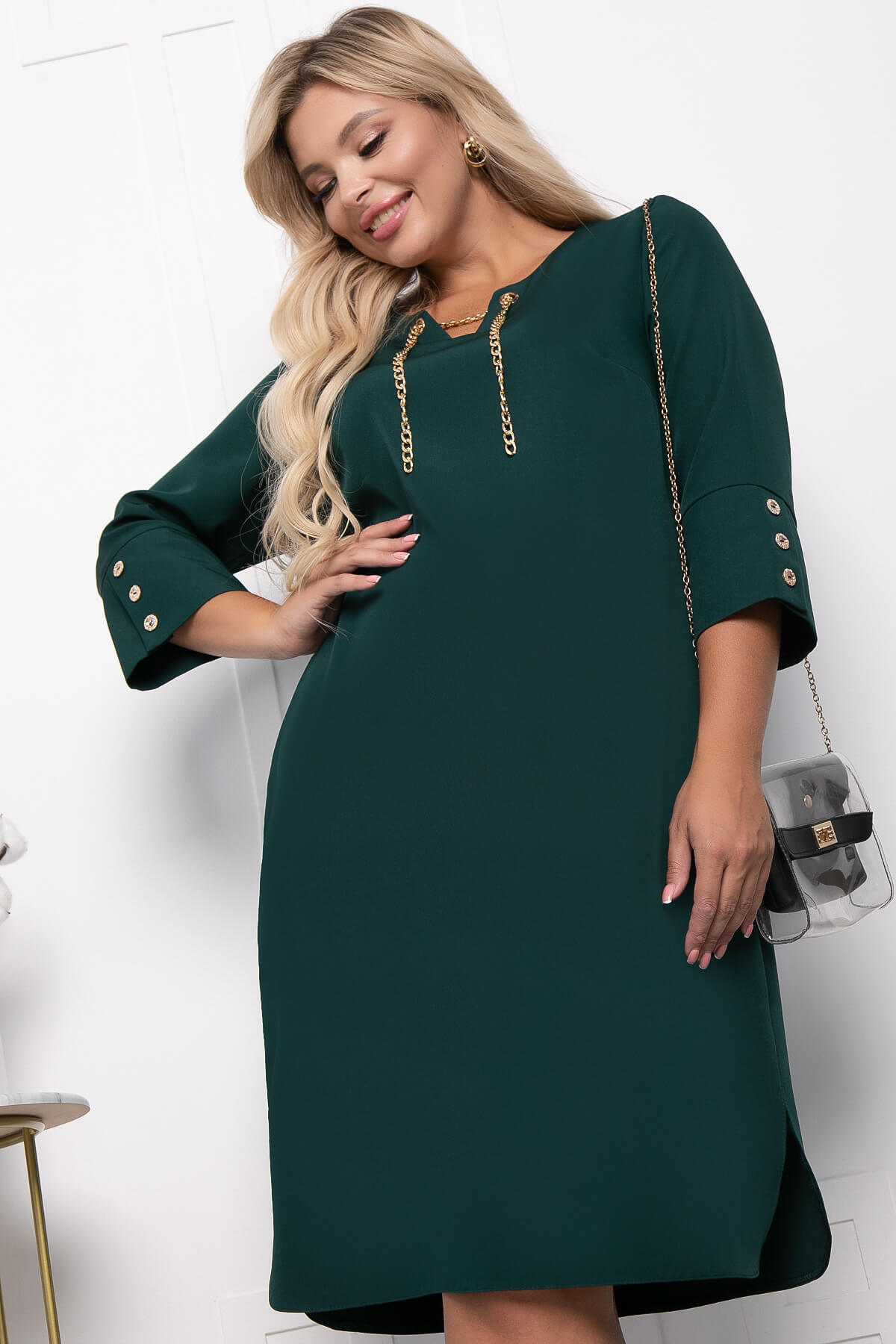 Женственное платье поможет в создании красивого делового образа. Украшением платья служит акцентный вырез со съемной декоративной вставкой - цепочкой. Рукав три четверти, втачной. По низу изделия в боковых швах разрезы.