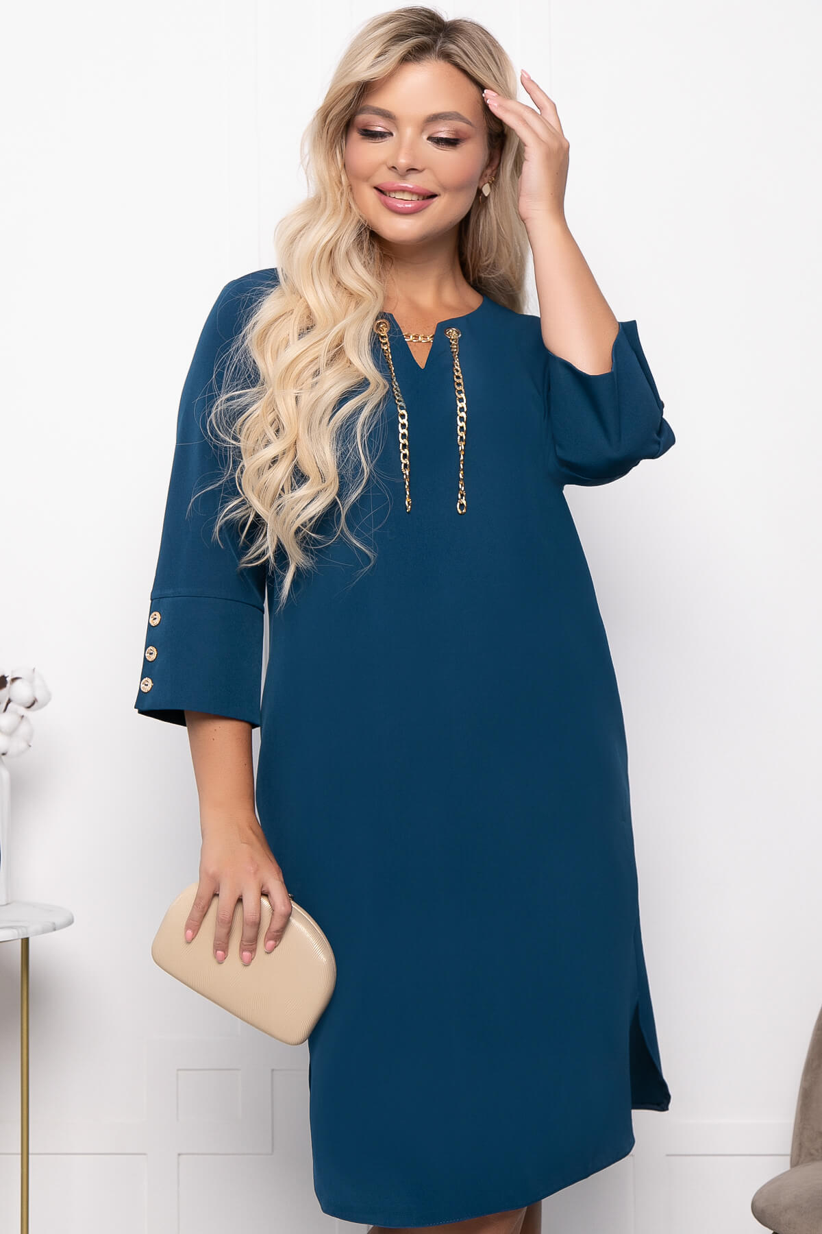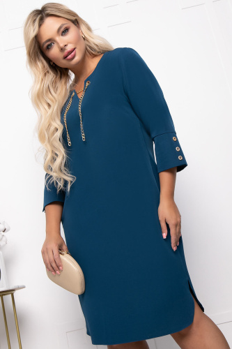 Женственное платье поможет в создании красивого делового образа. Украшением платья служит акцентный вырез со съемной декоративной вставкой - цепочкой. Рукав три четверти, втачной. По низу изделия в боковых швах разрезы.