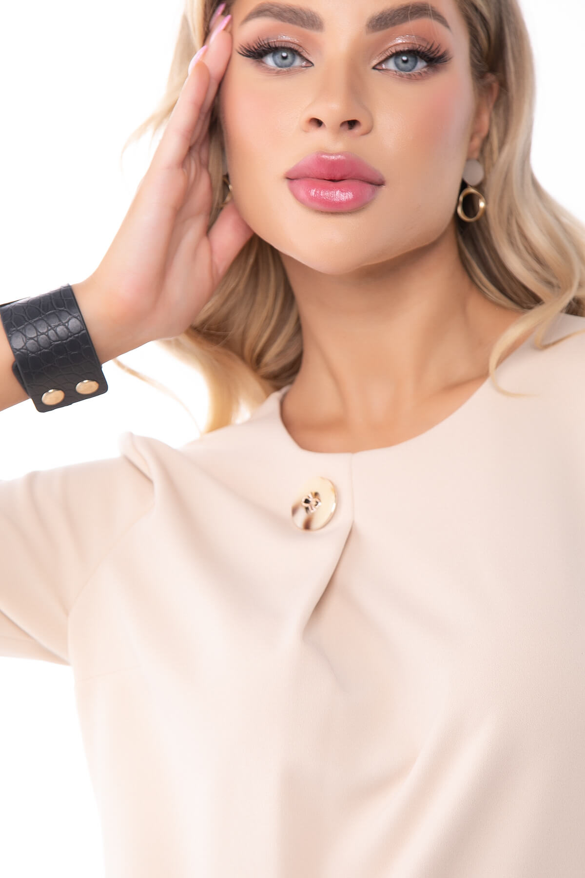 Платье из плотного трикотажа в базовом молочном оттенке прекрасно подойдёт в качестве повседневного или офисного варианта. Гармоничная длина и лаконичный дизайн сделают его просто незаменимым! Платье полуприлегающего кроя, по низу юбки сзади есть разрез для комфортного шага. Рукав втачной, три четверти. По горловине платья выполнен декор - складка, оформленная пуговицей.