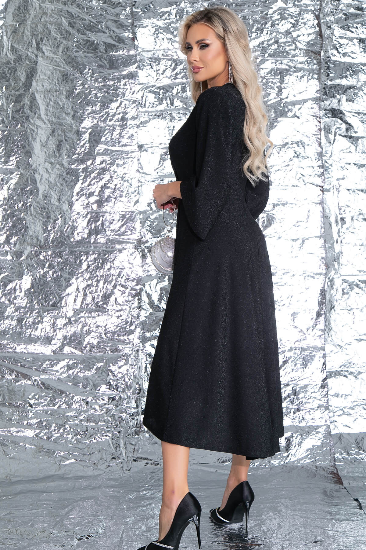Эффектное приталенное платье в мерцающем чёрном цвете. Данная модель создана для ценителей элегантных женственных нарядов. Рукав втачной, три четверти, расклешённый. Шикарная юбка с удлинением по спинке визуально вытягивает фигуру и делает ножки стройнее.