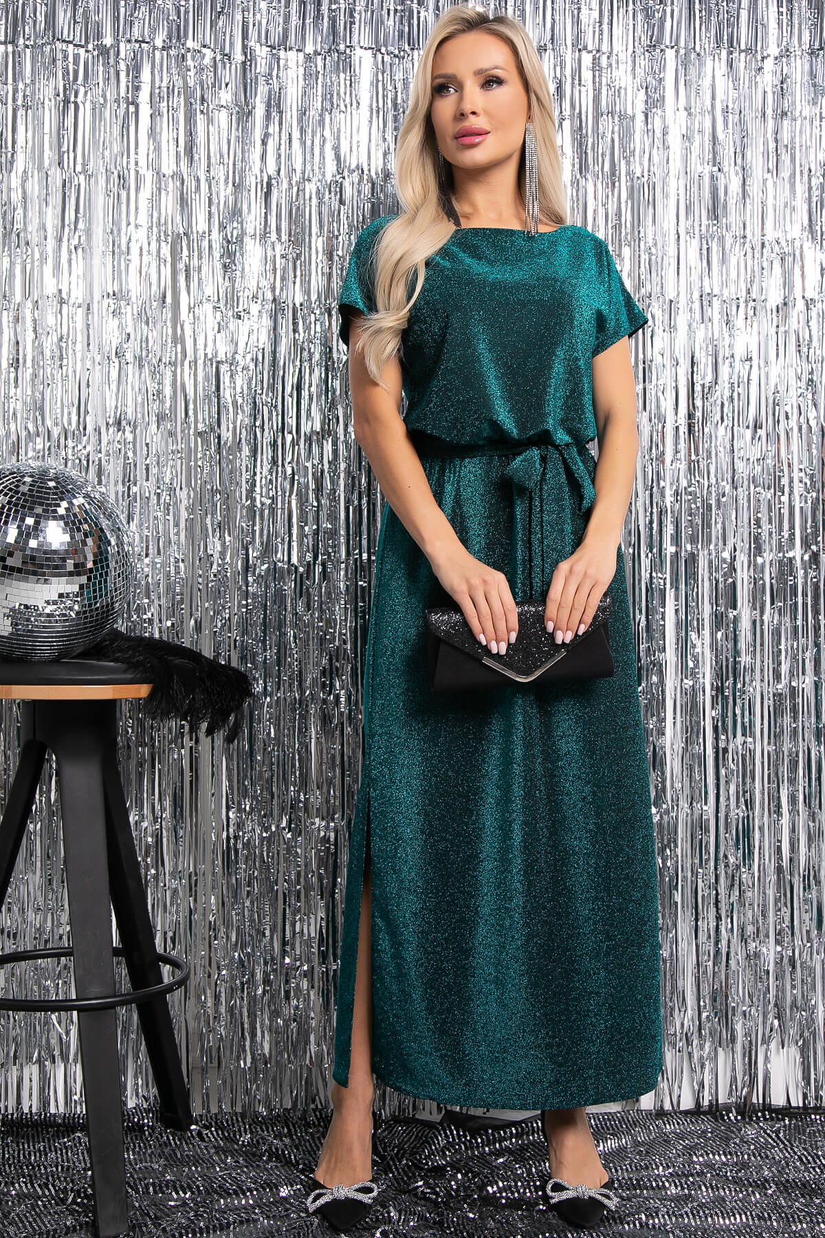 Платье создано для того, чтобы его обладательница сияла! Платье прямого кроя с укороченным, цельнокроеным рукавом. Образ дополняет наличие разрезов на боковых швах изделия. Платье без подкладки. Талия на резинке. В комплект входит пояс из основной ткани.