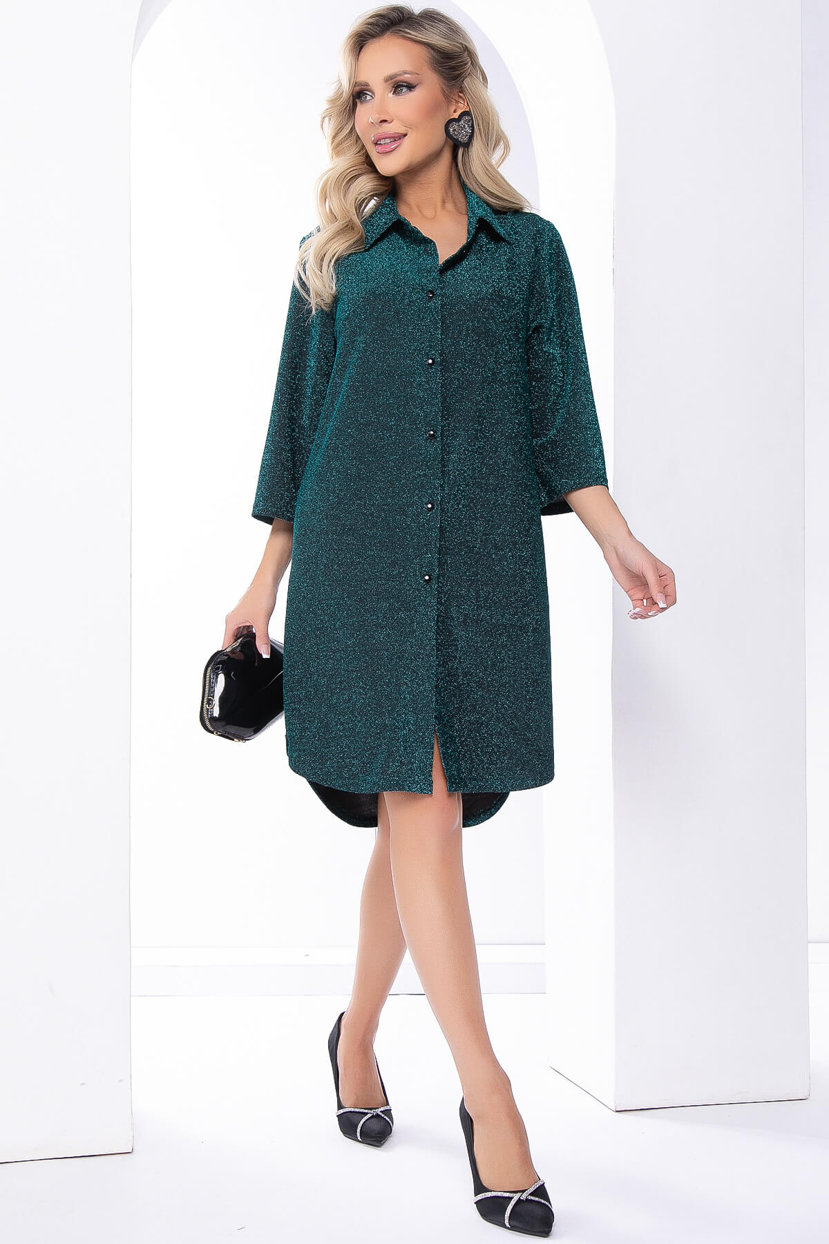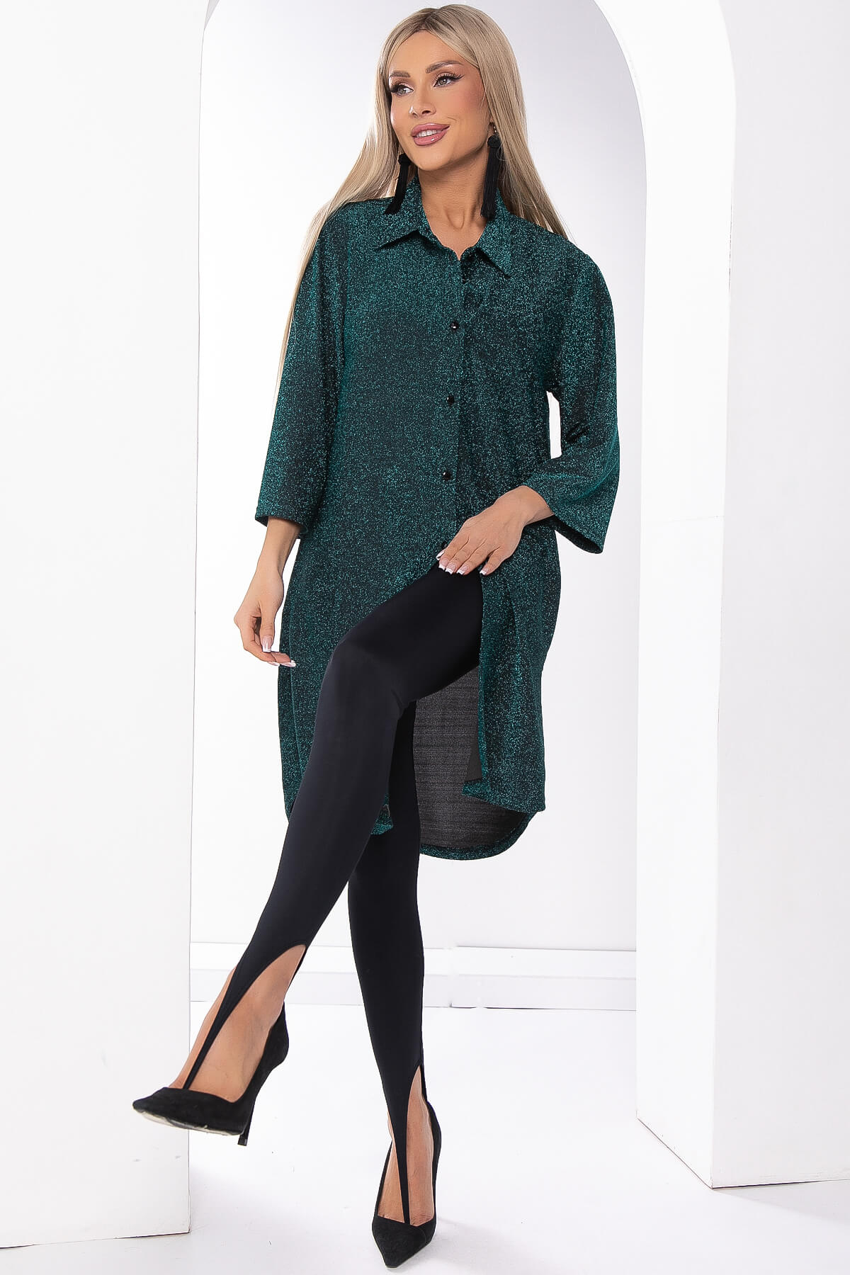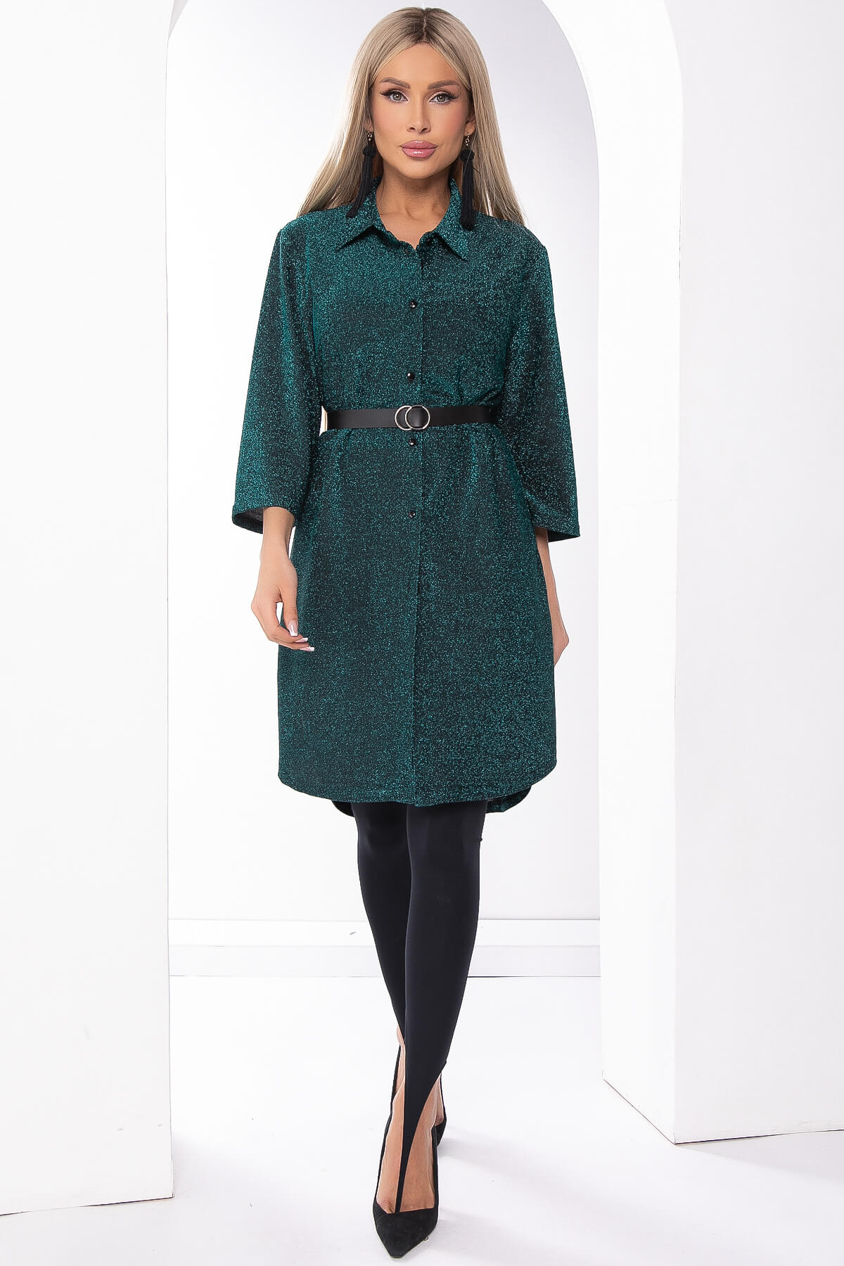 Изысканное платье-рубашка из люрекса – идеальный выбор для элегантных вечерних мероприятий. Его блестящая поверхность добавляет неповторимый шарм, а стильный крой придает образу современную изысканность. Подчеркните свою уникальность! Изделие можно носить как укороченное платье, так и как удлиненную рубашку, ведь оно отлично сочетается с лосинами! А если дополнить изделие любимым ремнем с элегантной пряжкой и образ заиграет новыми красками!