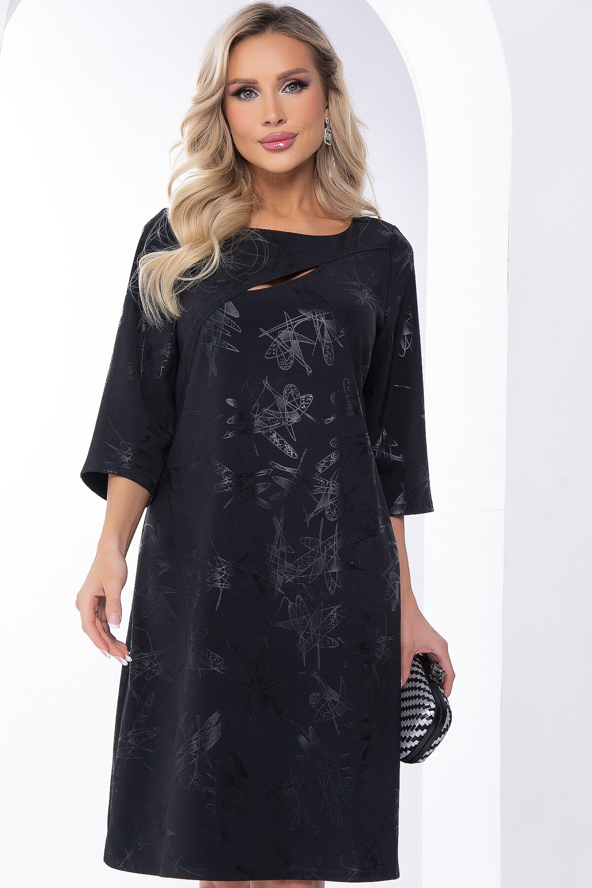Элегантное вечернее платье из плательной ткани с игривым принтом. Свободный крой обеспечивает комфорт и легкость движений. Акцентный вырез на груди придает образу изысканности и женственности. Рукав втачной, три четверти. Это платье станет идеальным выбором для особых моментов в вашей жизни.