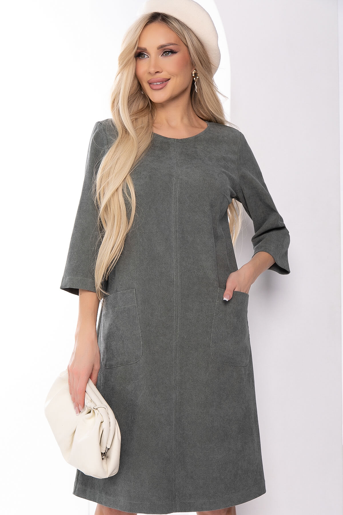 Повседневное платье из плотной ткани сделает ваш образ воздушным и очень романтичным. Изделие отлично смотрится с любыми видами украшений и идеально подходит на каждый день. Рукав широкий, три четверти. Платье с накладными карманами.