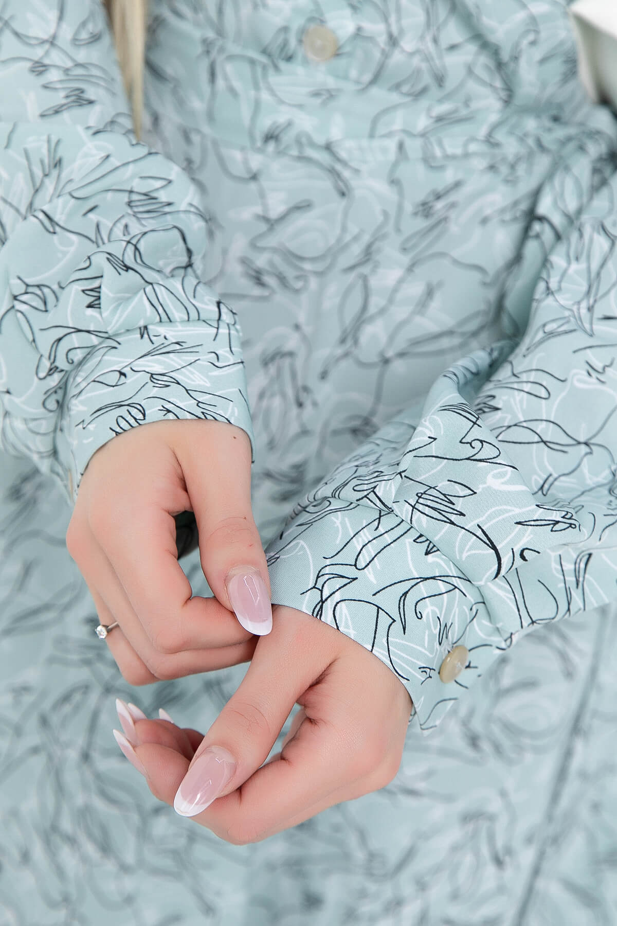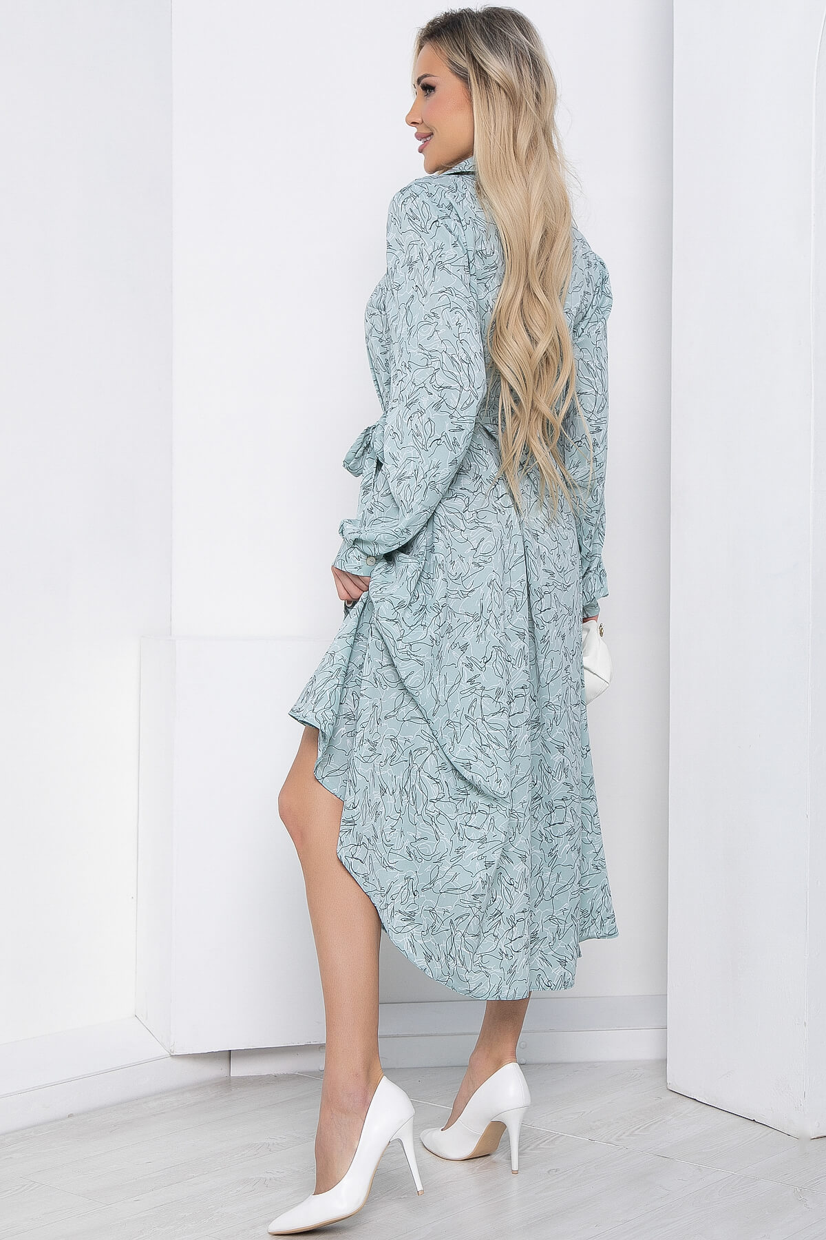 Легкое и женственное платье в нежном мятном цвете. В таком длинном платье Вы будете изящной и неповторимой. Расклешенный крой делает образ еще более романтическим. В верхней части пуговицы до талии. Рукав длинный, втачной, по низу манжет с пуговицей. Пояс из основной ткани входит в комплект.
