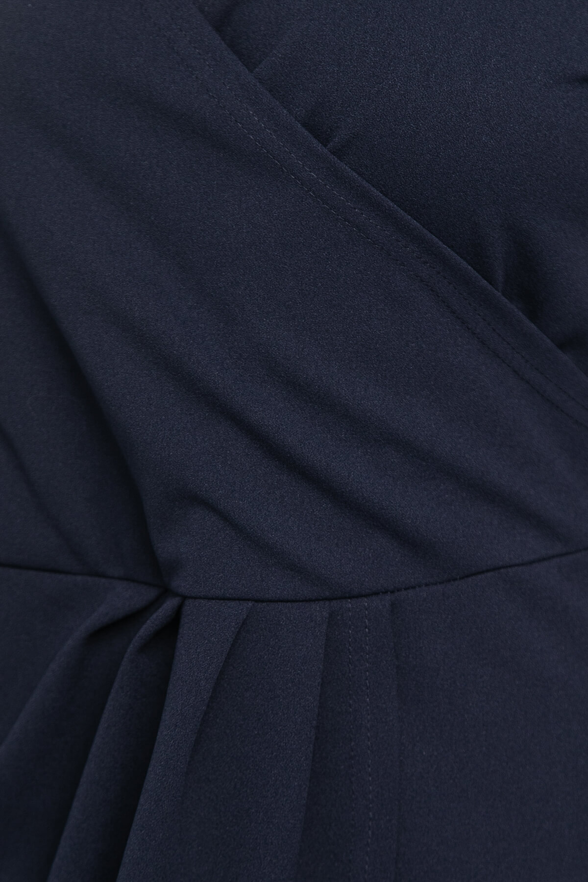 Нарядное платье на запах полуприлегающего силуэта очарует каждого. Акцентом данной модели является ассиметричный разрез по низу изделия, который позволит скрыть недостатки фигуры. Рукав длинный, втачной. V-образный вырез на запахе идеально подчеркивает зону декольте. В комплект входит пояс из основной ткани, который подчеркнет линию талии.
