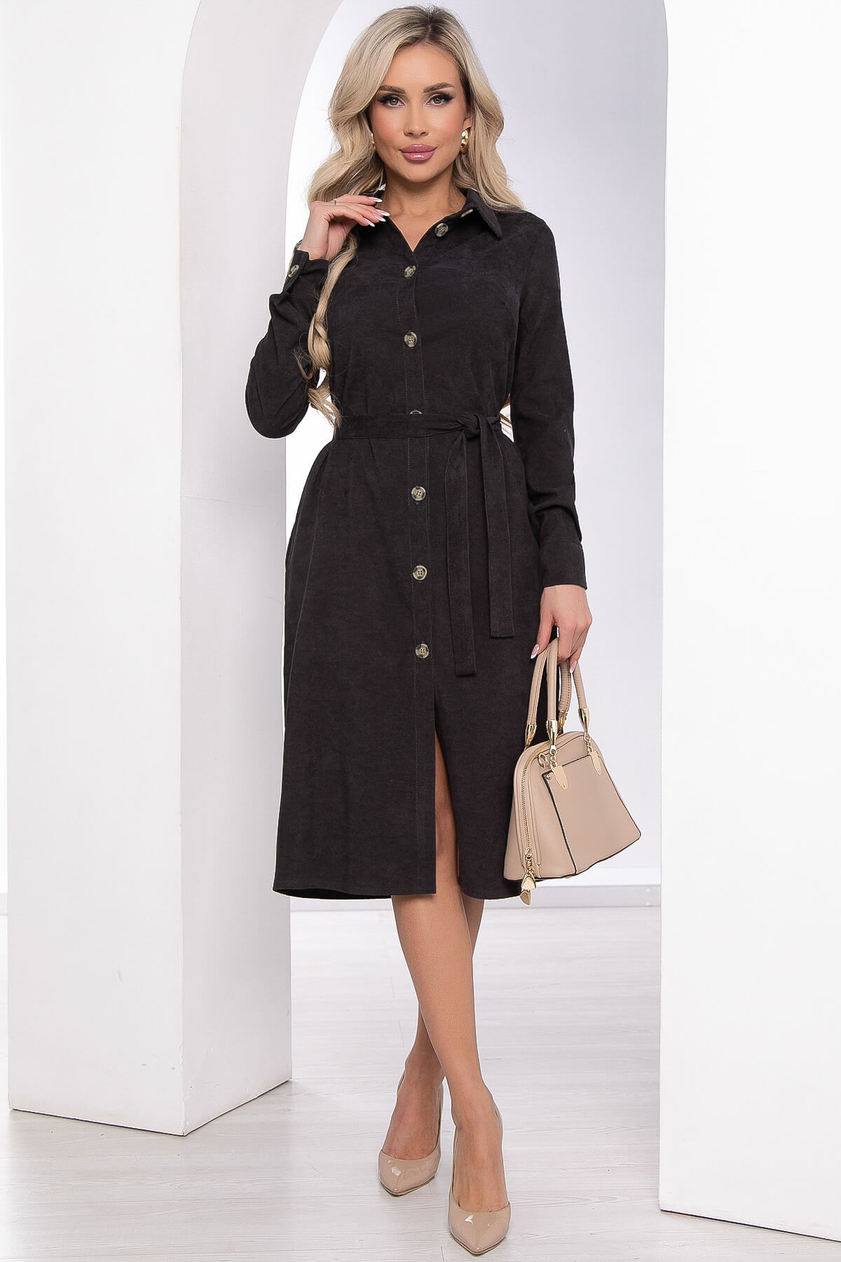 Это идеальное сочетание стиля и комфорта, которое подарит вам уникальный образ. Классическое платье - рубашка в насыщенном благородном цвете придает неповторимый шарм. Вельветовое платье обладает великолепным фасоном и отлично подчеркивает фигуру, создавая элегантный силуэт Отложной воротничок, рукав длинный на манжете. Модель можно носить с поясом из основной ткани.