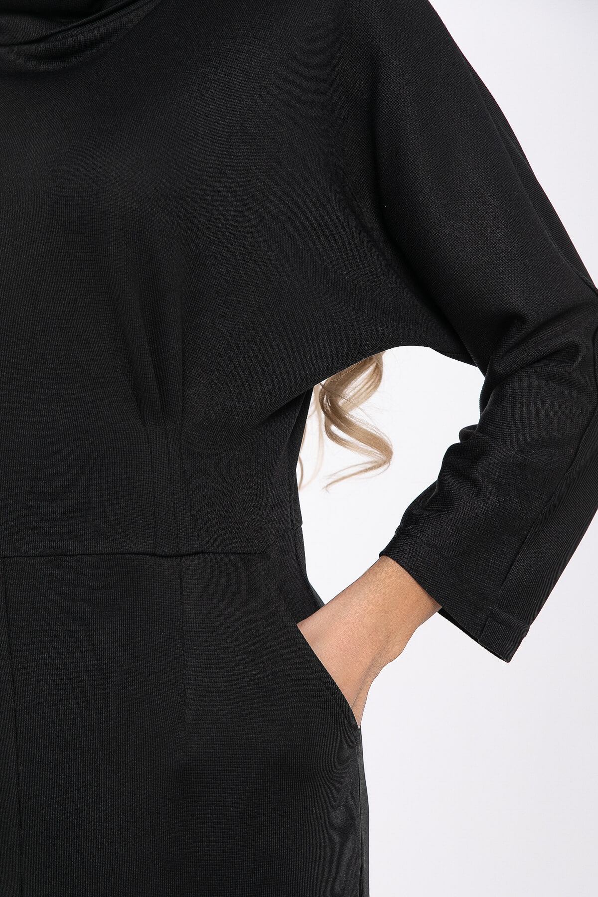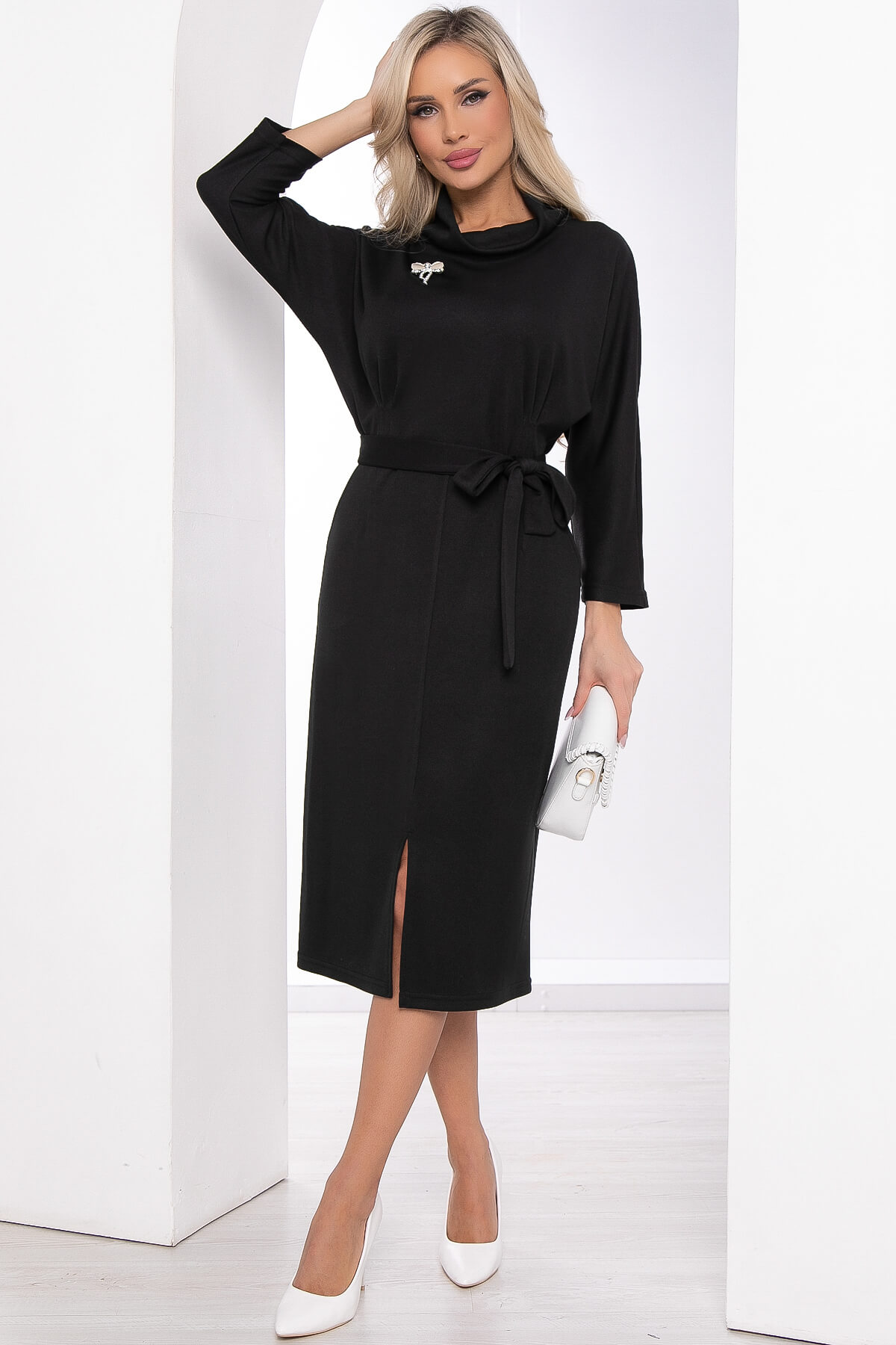 Элегантное трикотажное платье стильного кроя. Модель такую можно носить в офис или на деловую встречу. Цельнокроеный рукав и отрезная линия по талия с защипами, что придает платью легкий объем. По переду изделие дополняет элегантный разрез, который придает образу игривости. По бокам платья карманы. Пояс из основной ткани и украшение входят в комплект.