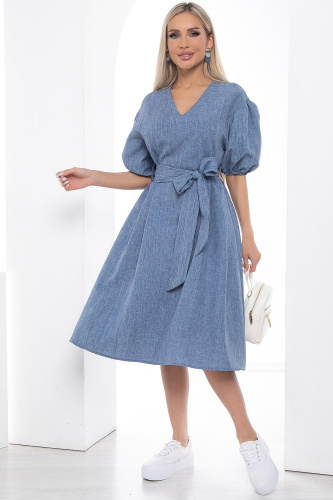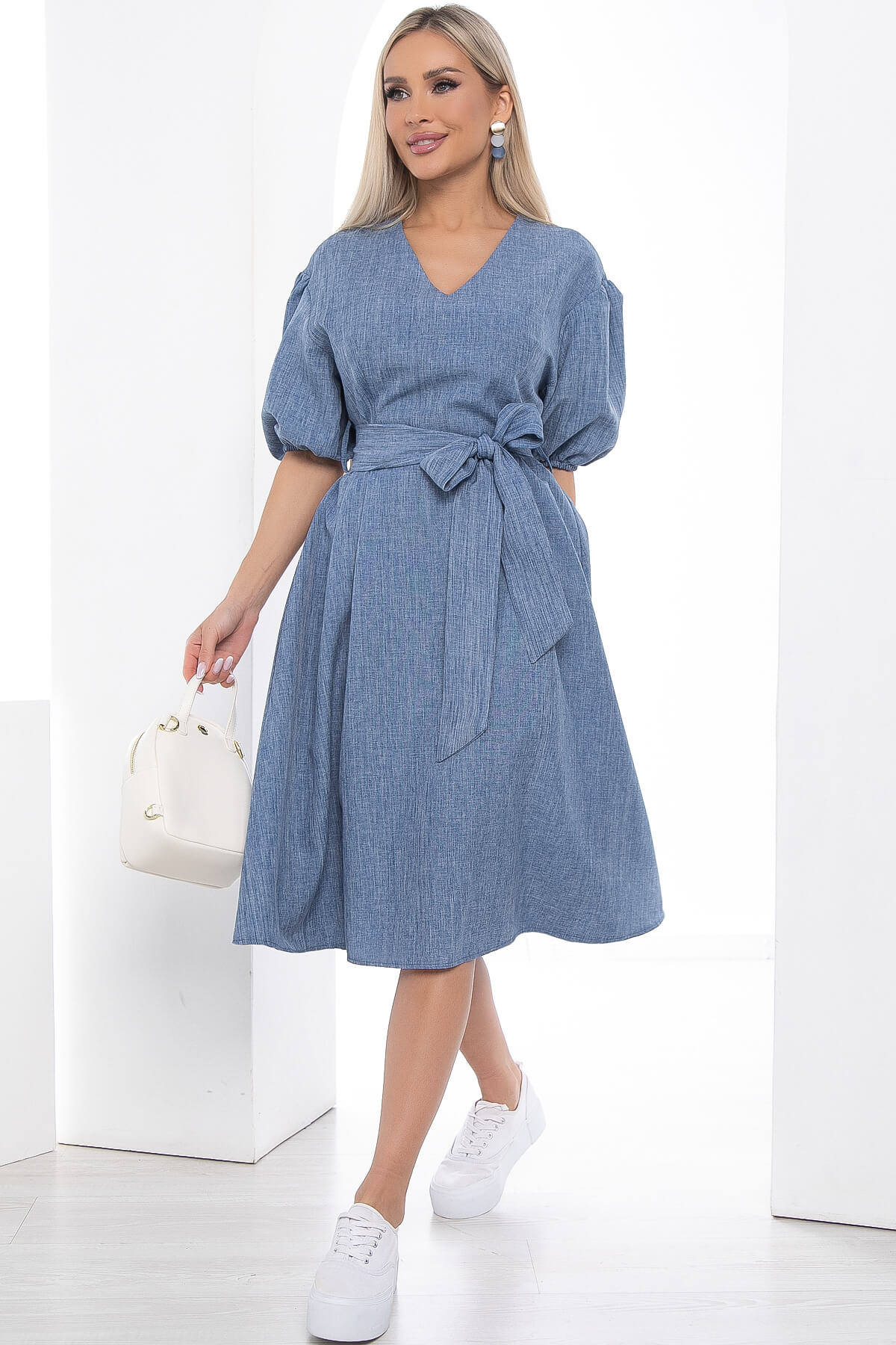 Платье приталенного силуэта, с акцентным поясом-кушаком подчеркивающим красоту линий женского тела. Платье с коротким, эффектным рукавом-фонарик. Изделие с изящным V-образным вырезом, и застежкой-молнией по спинке.