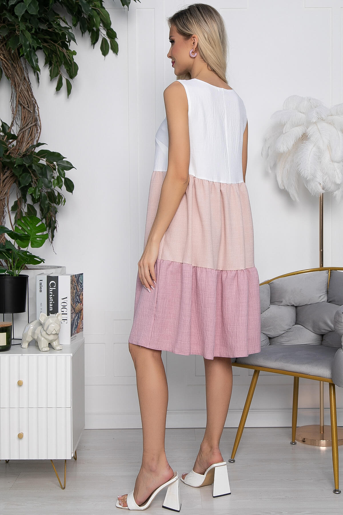 Свободное летнее платье без рукавов будет превосходным вариантом для непринуждённого наряда на каждый день. Отличный выбор для прогулки с друзьями. Дополнить образ можно туфлями, босоножками или кроссовками.