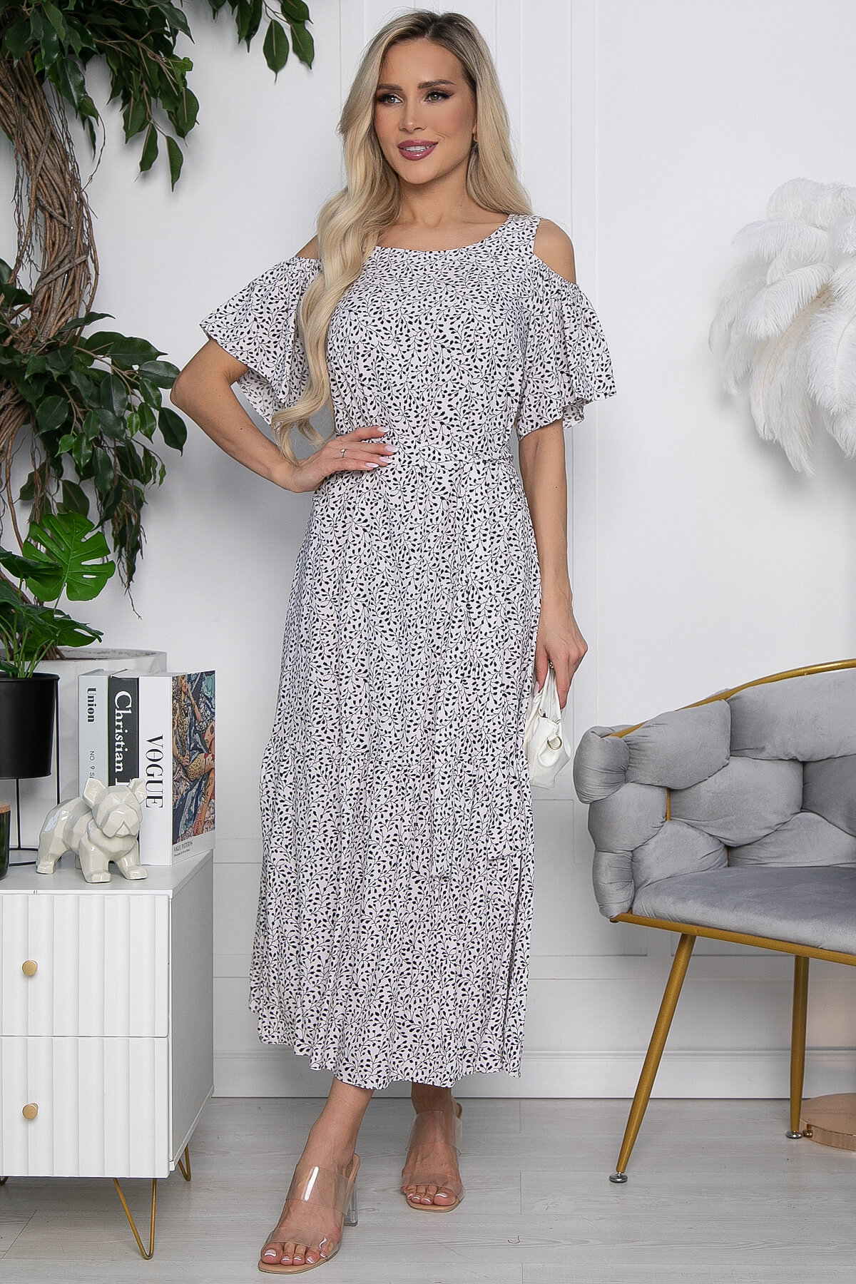 Шикарное платье с акцентными рукавами не оставит без внимания окружающих. Вырезы на плечах придадут утонченность и добавят образу кокетства. Платье можно носить, как с поясом, подчеркивая всю красоту фигуры, так и без - тогда образ получится более расслабленный.