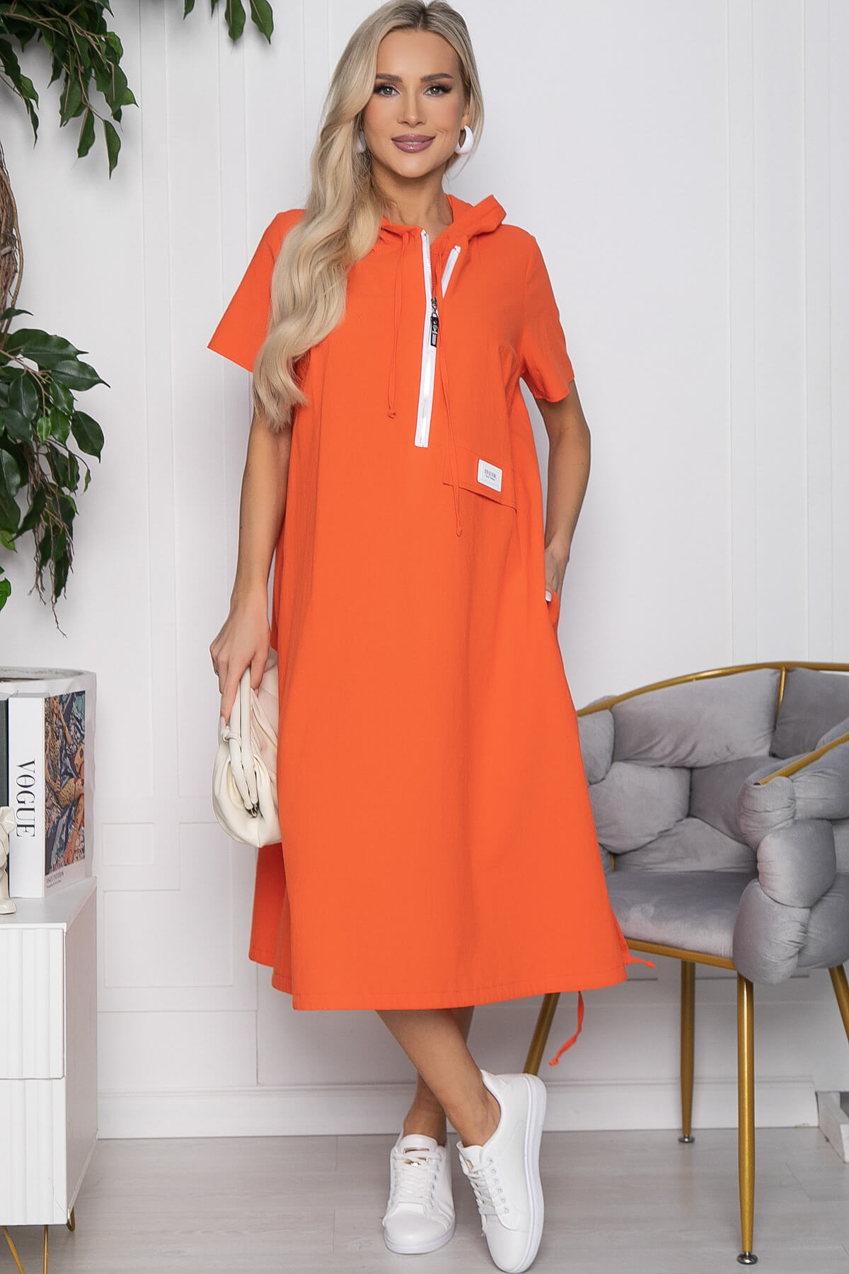 Свободный крой платья не сковывает движений, что особенно важно для тех кто ведет активный образ жизни. Его универсальность позволяет надевать его как на работу, так и для прогулки в парке. По низу платье регулируется кулиской. Карманы расположены сбоку.