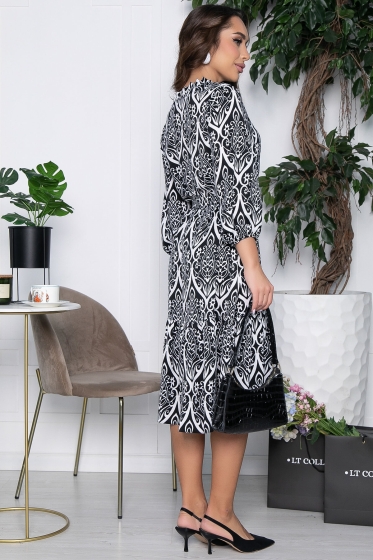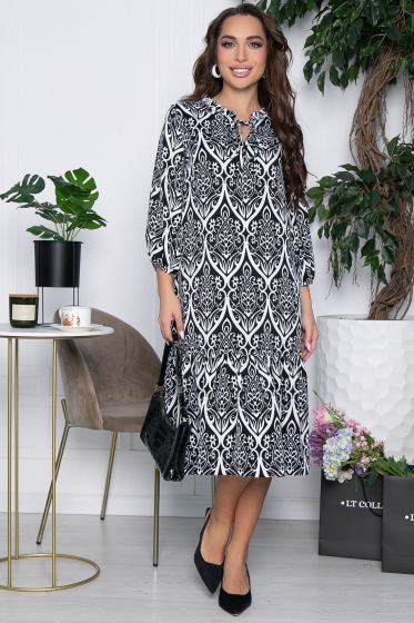 Чёрное платье с узорами - отличный выбор для комфортного повседневного образа! Легкое платье подходит для любого повседневного случая или особых мероприятий. Оно наполнит ваш образ легкостью и грацией, подчеркивая вашу индивидуальность. Платье с поясом, внизу волан. Рукав 3/4, низ рукава на резинке.