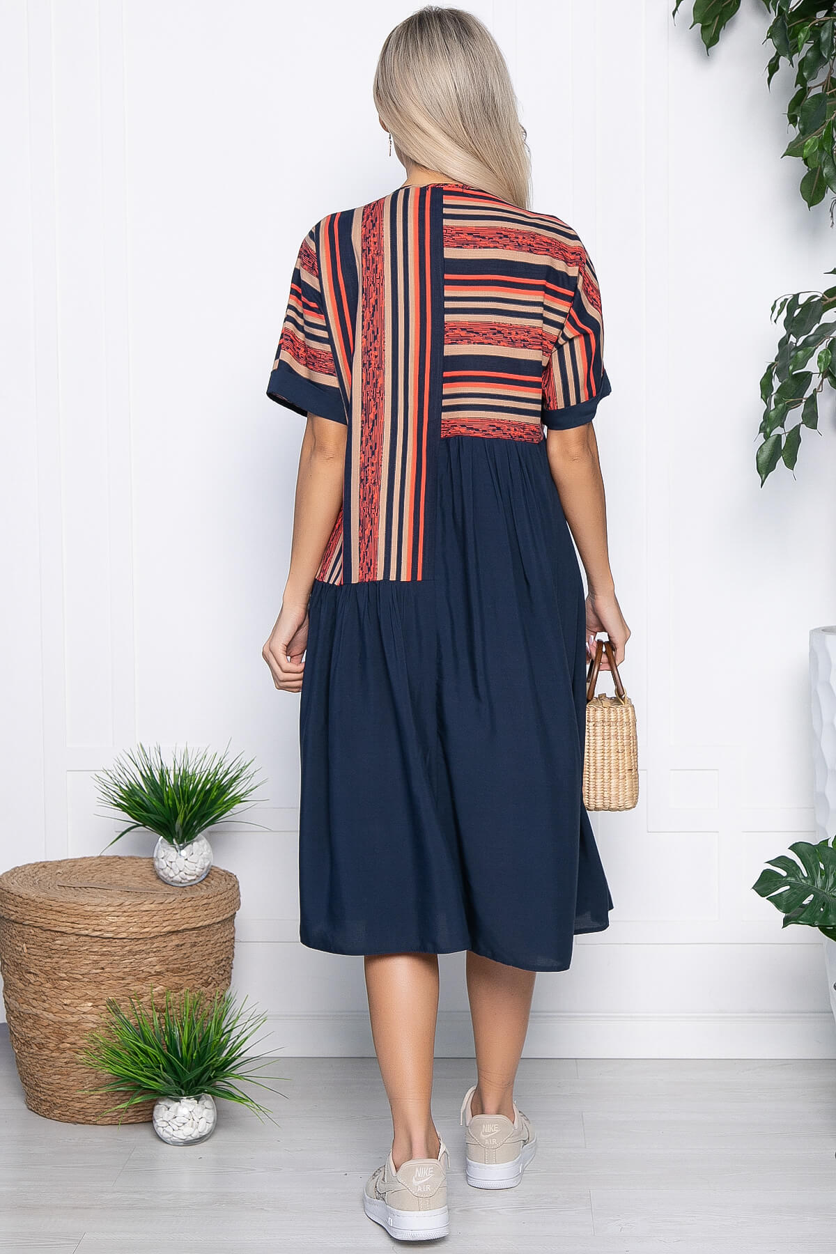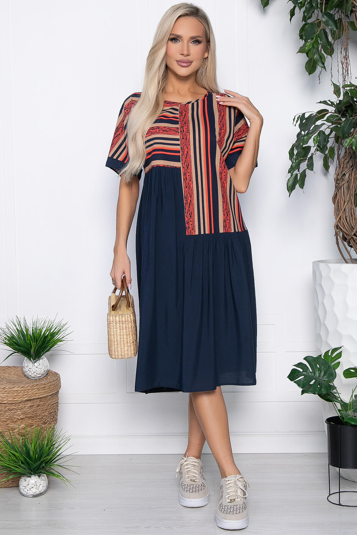Красивое платье, которое прекрасно подойдет для повседневных образов! А в отпуске так просто незаменимая вещь! Платье свободного силуэта, удобной длины, рукав цельнокроеный - очень комфортен в носке, рукав короткий на манжете. Игра полоски прекрасно корректирует линии фигуры, визуально вытягивая силуэт, благодаря вертикальным полосам. Платье без подкладки и без молнии.