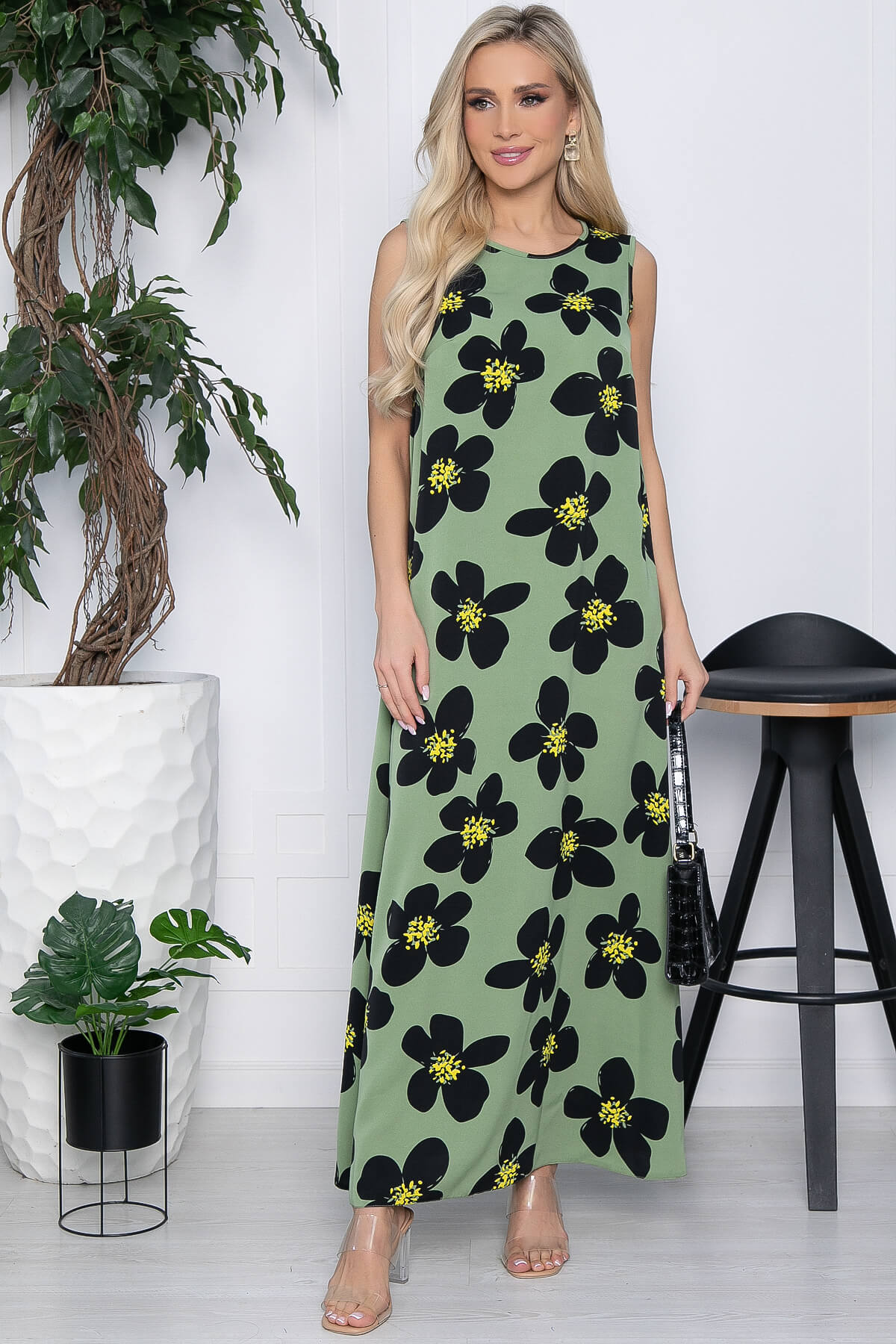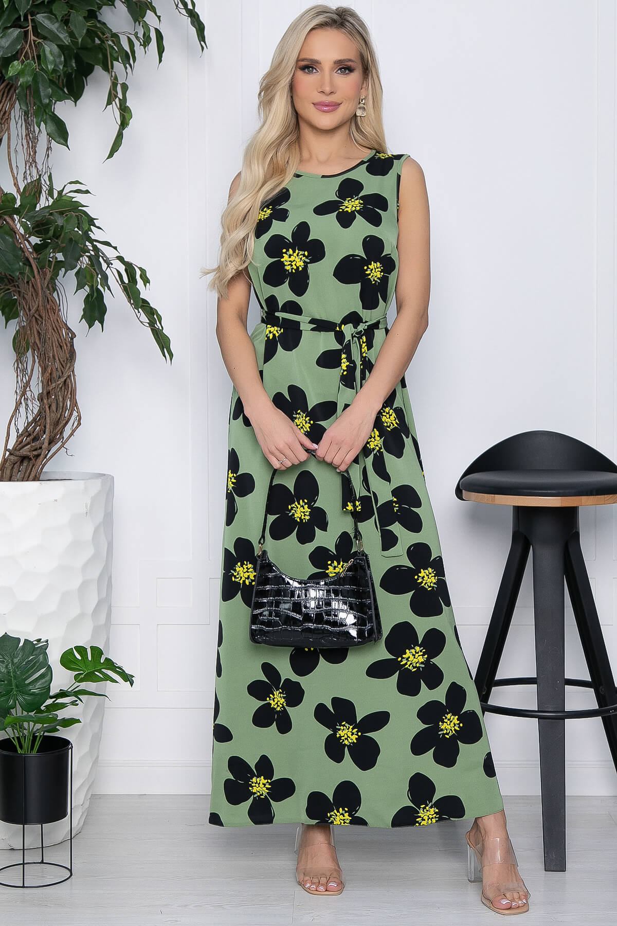 Привлекательное платье с крупным цветочным принтом для солнечных летних дней! Можно сочетать с белыми кедами для создания стильного повседневного образа. Для более нарядного образа можно подобрать туфли, сумку и аксессуары. В комплект входит пояс из основной ткани, которым можно подчеркнуть талию.