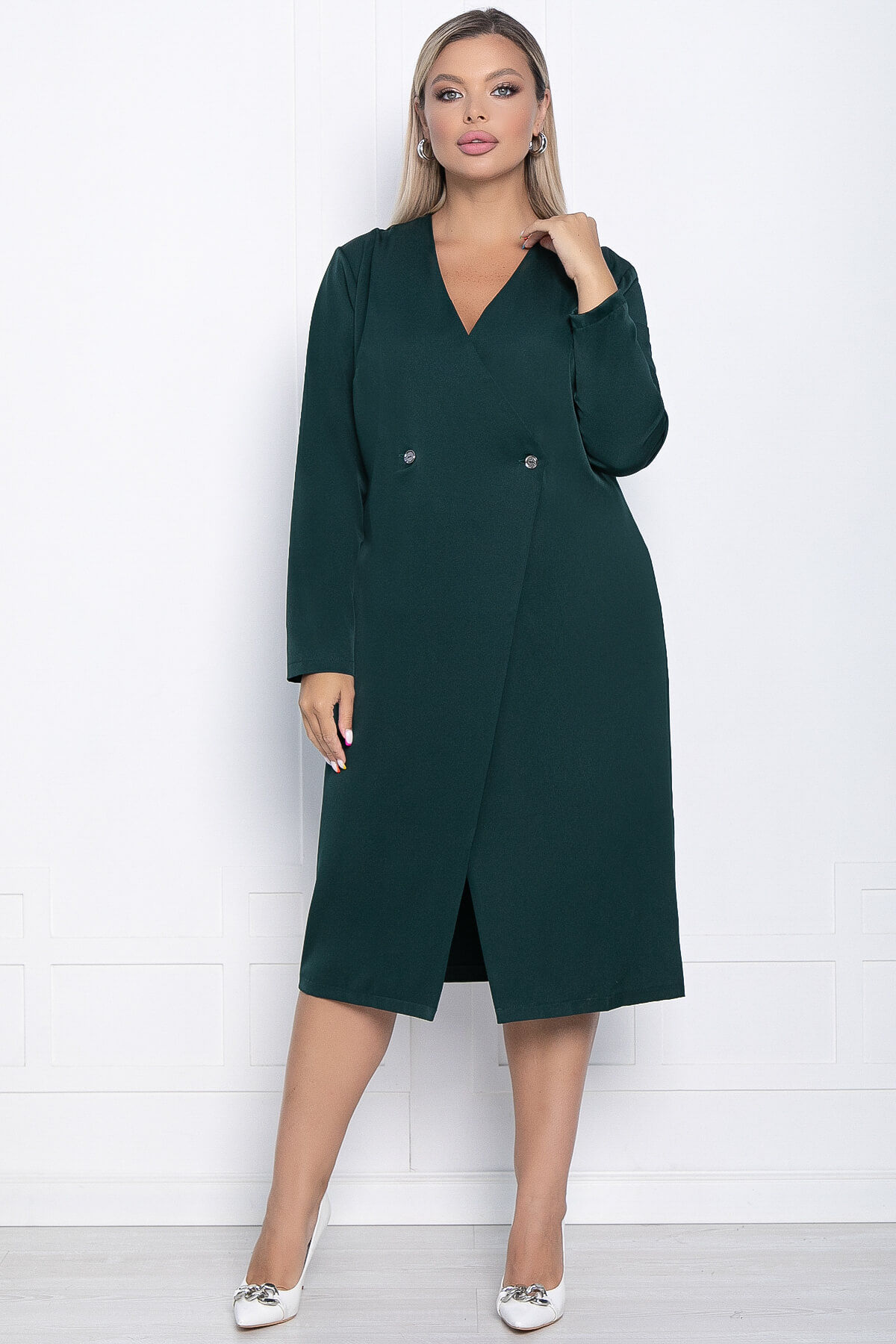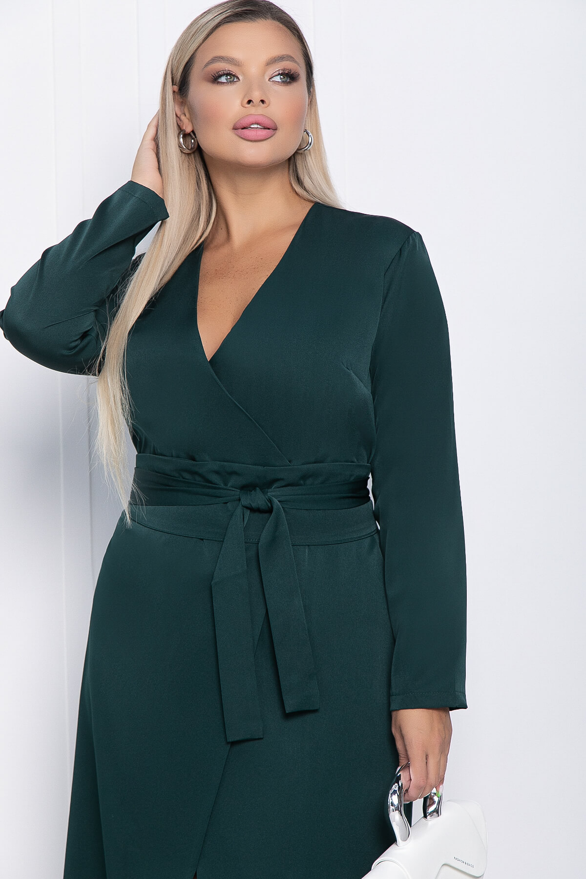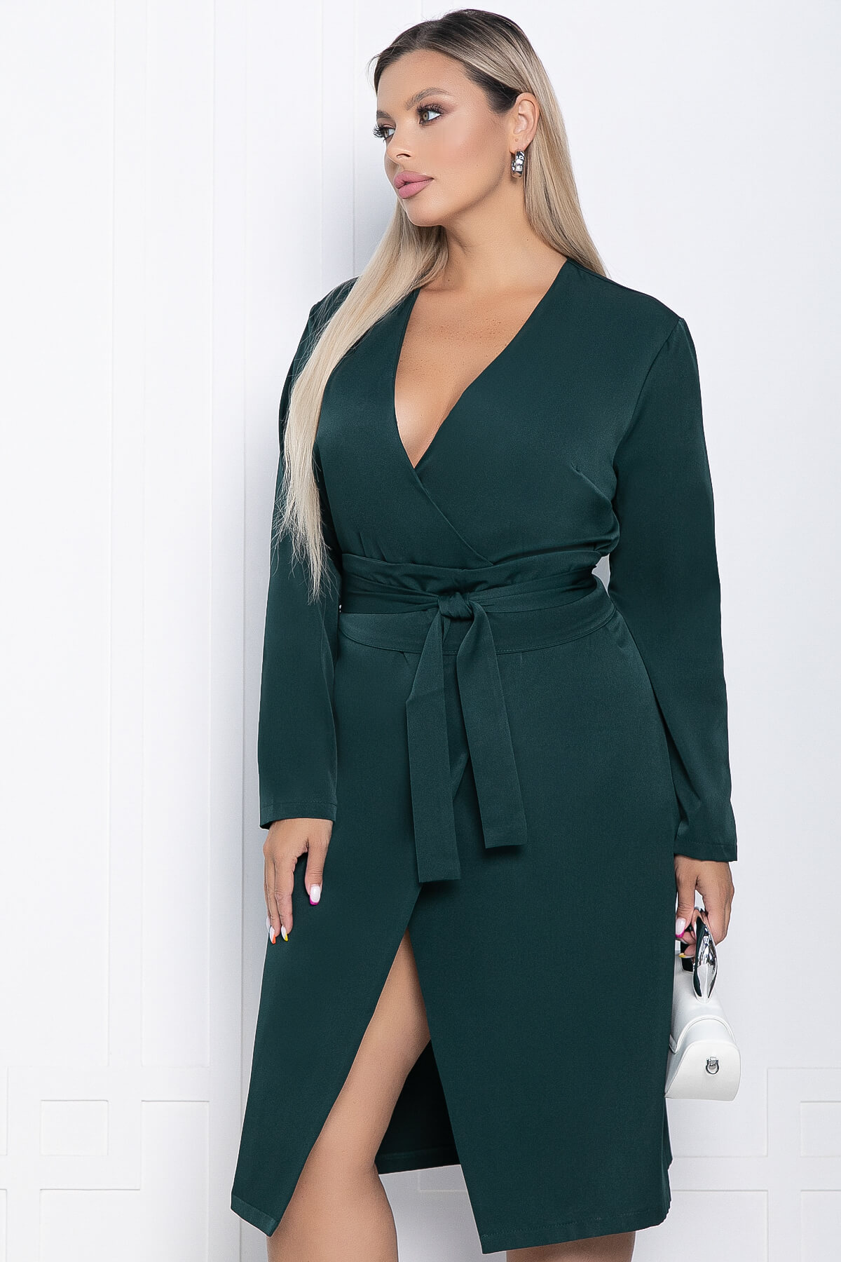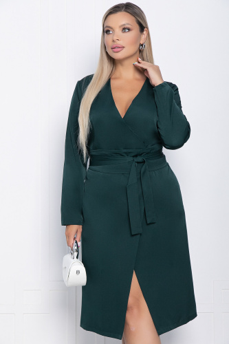 Роскошное изумрудное платье с запахом — отличный выбор для деловой встречи или похода в ресторан. Благодаря поясу, оно выгодно подчёркивает женственность фигуры. V-образный вырез придаёт образу особую привлекательность.