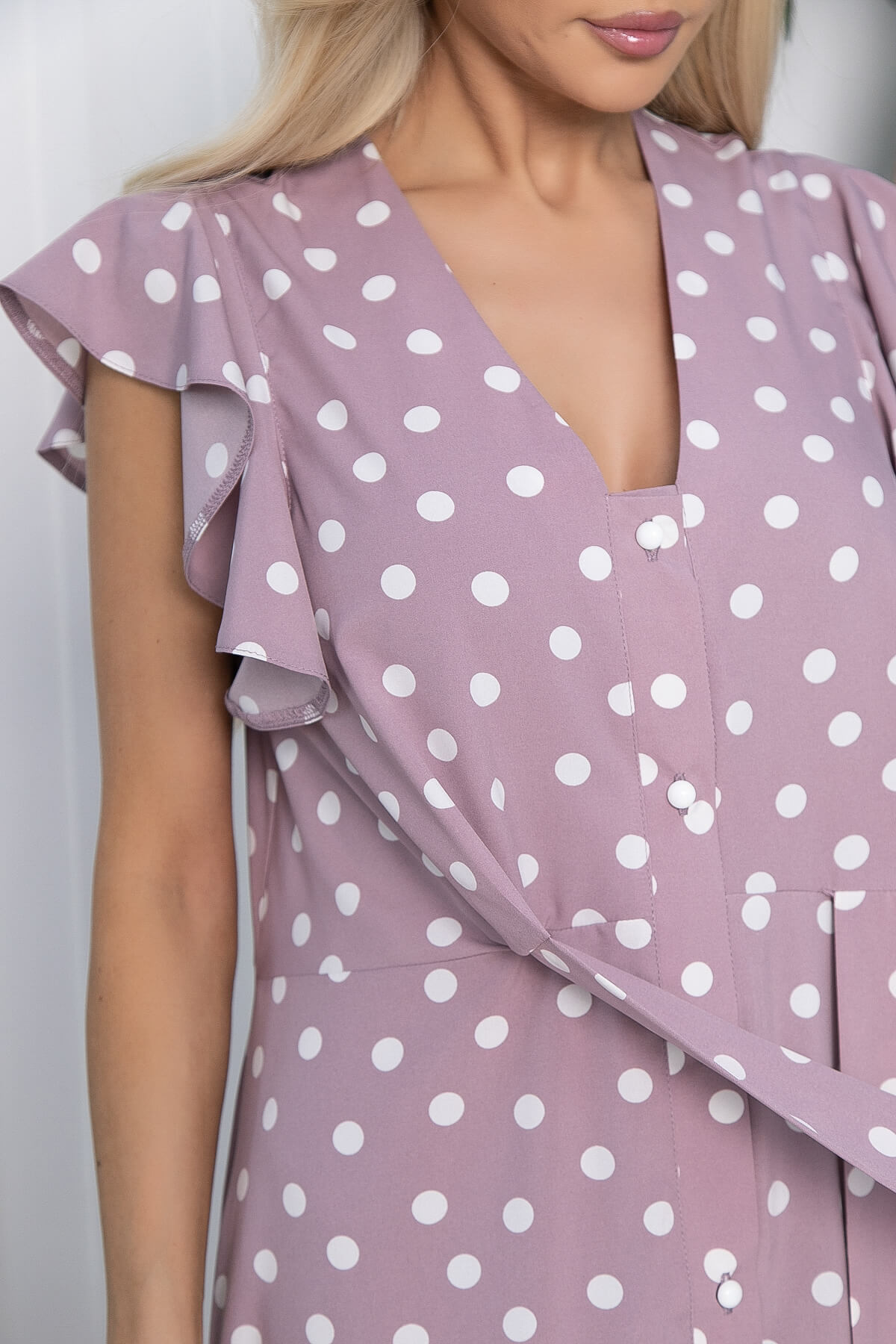 Утонченная женственность и романтизм этого легкого летнего платья призваны дать почувствовать себя неповторимой, роскошной и совершенной каждой женщине. Оно легко и ненавязчиво подчеркивает все достоинства женской фигуры. Органичное декольте и воланы на плечах деликатно акцентируют внимание на женской груди. Завязки подчеркивают линию талии. Застежка на всю длину платья позволяет дозировано приоткрывать ножки. Платье отрезное по линии талии. Верх переда - с притачным поясом, завязывающийся вокруг талии на спинке. Низ переда - коническая юбка. Рукав скроен по типу "крылышко".