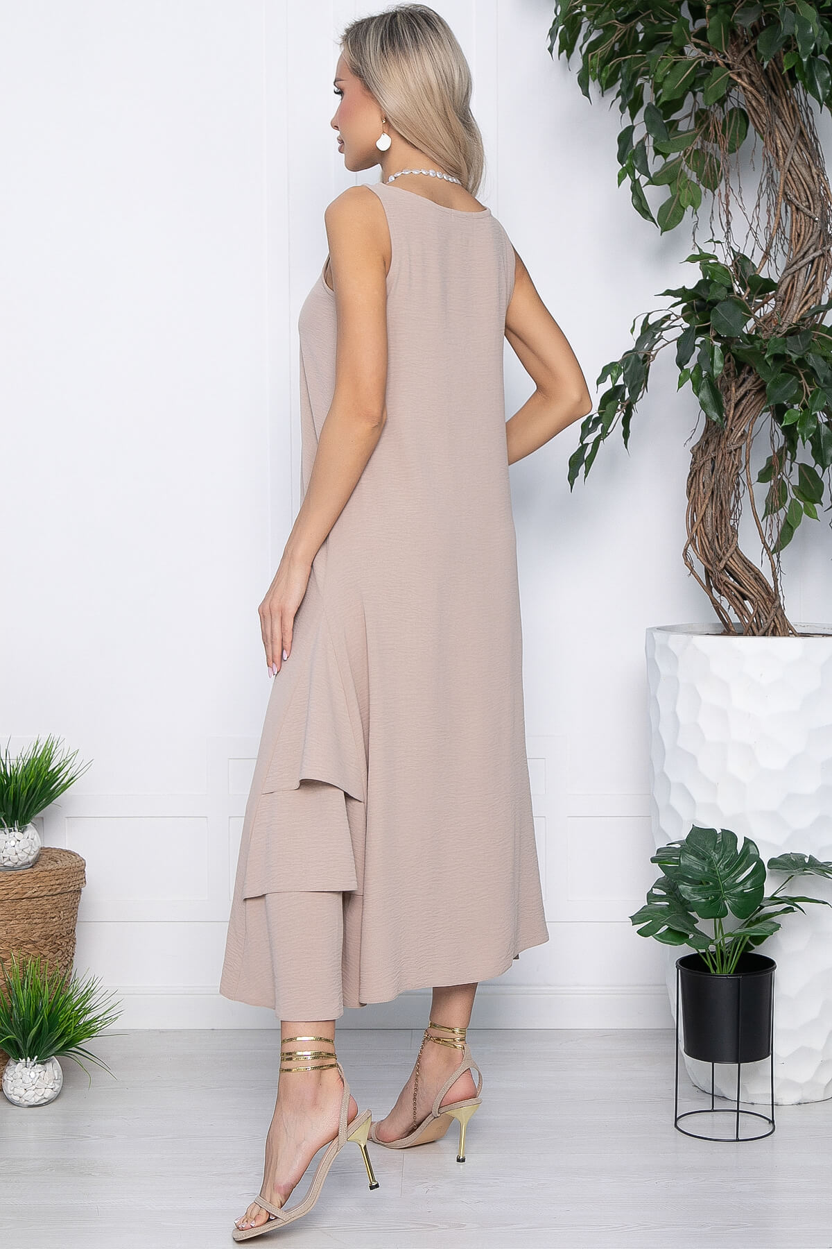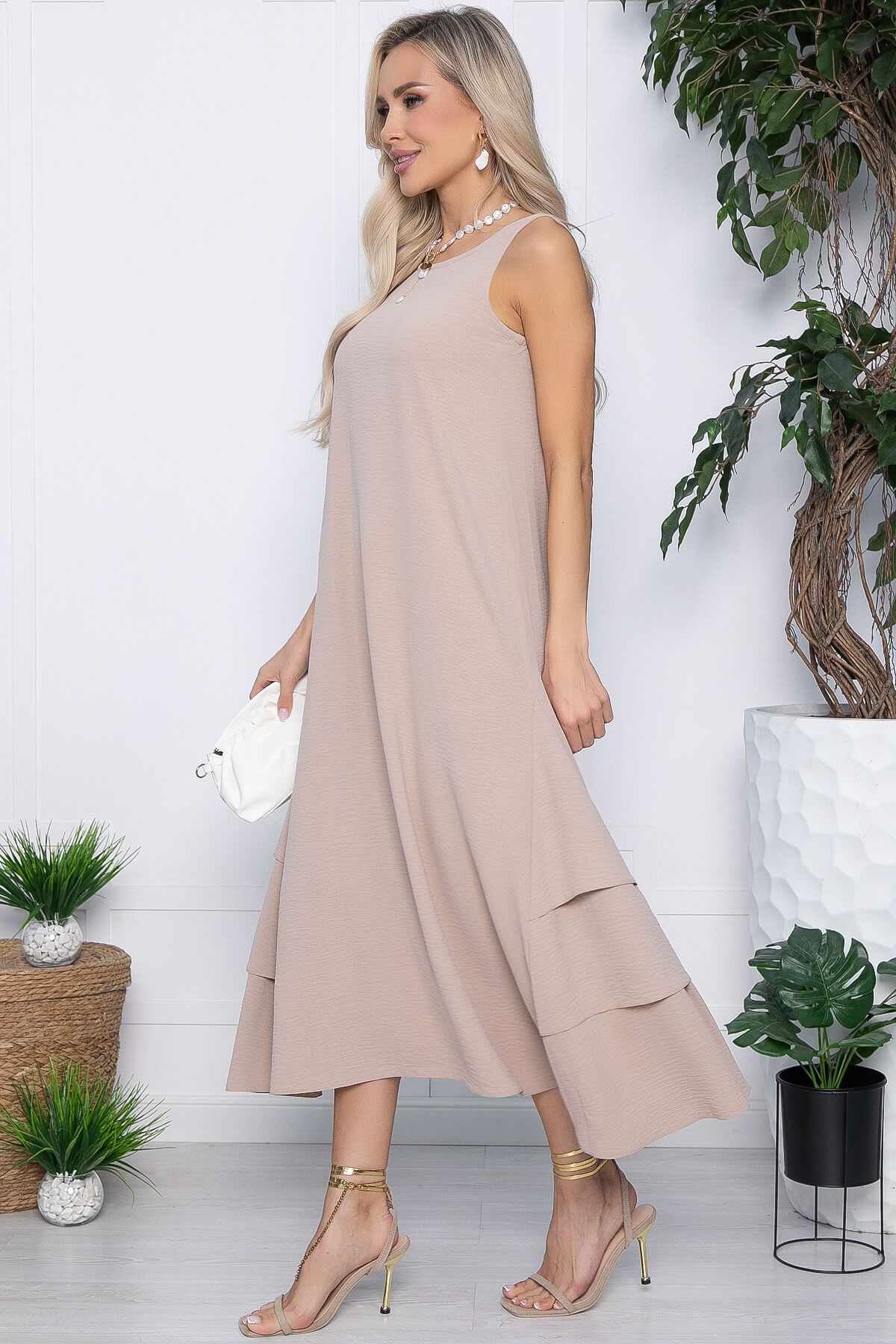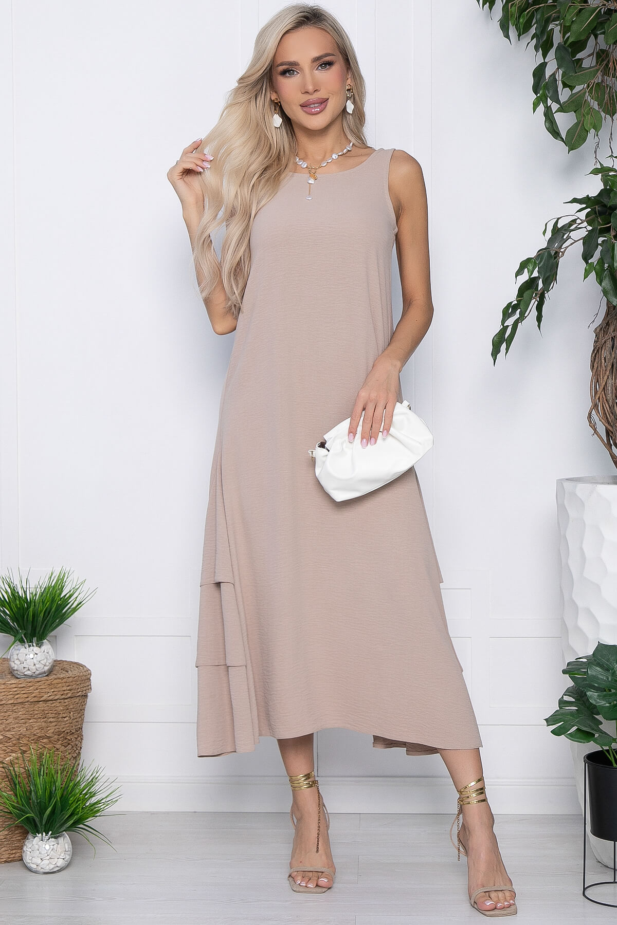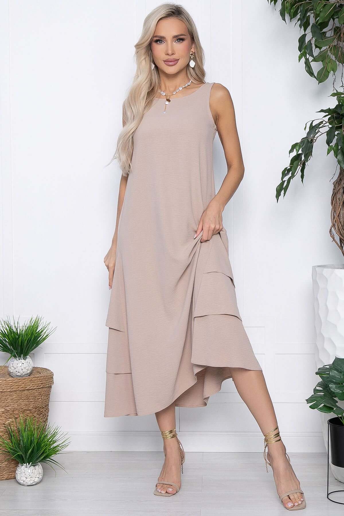 Платье со вставками в виде нескольких ярусов — необычная модель в романтическом стиле, которая позволит выглядеть женственно и привлекательно каждый день. Фасон А-силуэта без рукавов плавно расклешается к низу, не подчеркивает нюансы фигуры, позволяет чувствовать себя комфортно и уверенно. Главный акцент платья — боковые вставки в виде клиньев, которые добавляют образу легкости и создают эффект летящей походки. Носить модель можно как в качестве самостоятельного элемента гардероба, так и поверх базовых однотонных футболок, топов.