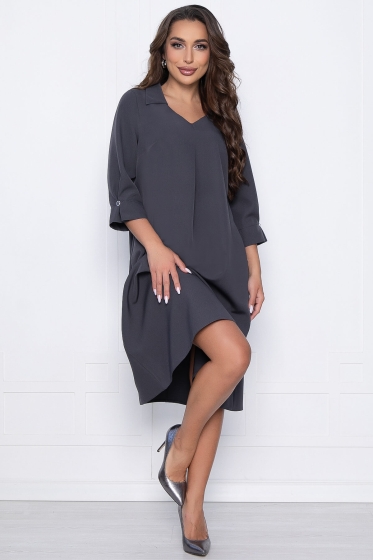 Платье свободного кроя длиной миди - отличный вариант для работы в офисе или для торжественных мероприятий! Воротничок отложной, переходит в V-образный вырез на горловине, который оканчивается защипом. Рукав втачной 3/4, украшен по низу защипом с пуговицей. К изделию в комплекте идёт пояс с декоративной пряжкой.