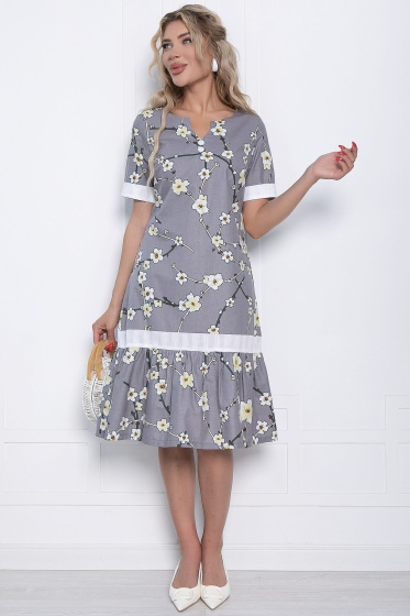 Платье свободного кроя, по низу изделия полоска из отделочной ткани и рюша из основной ткани, горловина обработана рельефной обтачкой, спереди имитация пуговиц, по низу рукавов манжеты из отделочной ткани. Пояс из основной ткани входит в комплект, с помощью которого можно подчеркнуть талию.