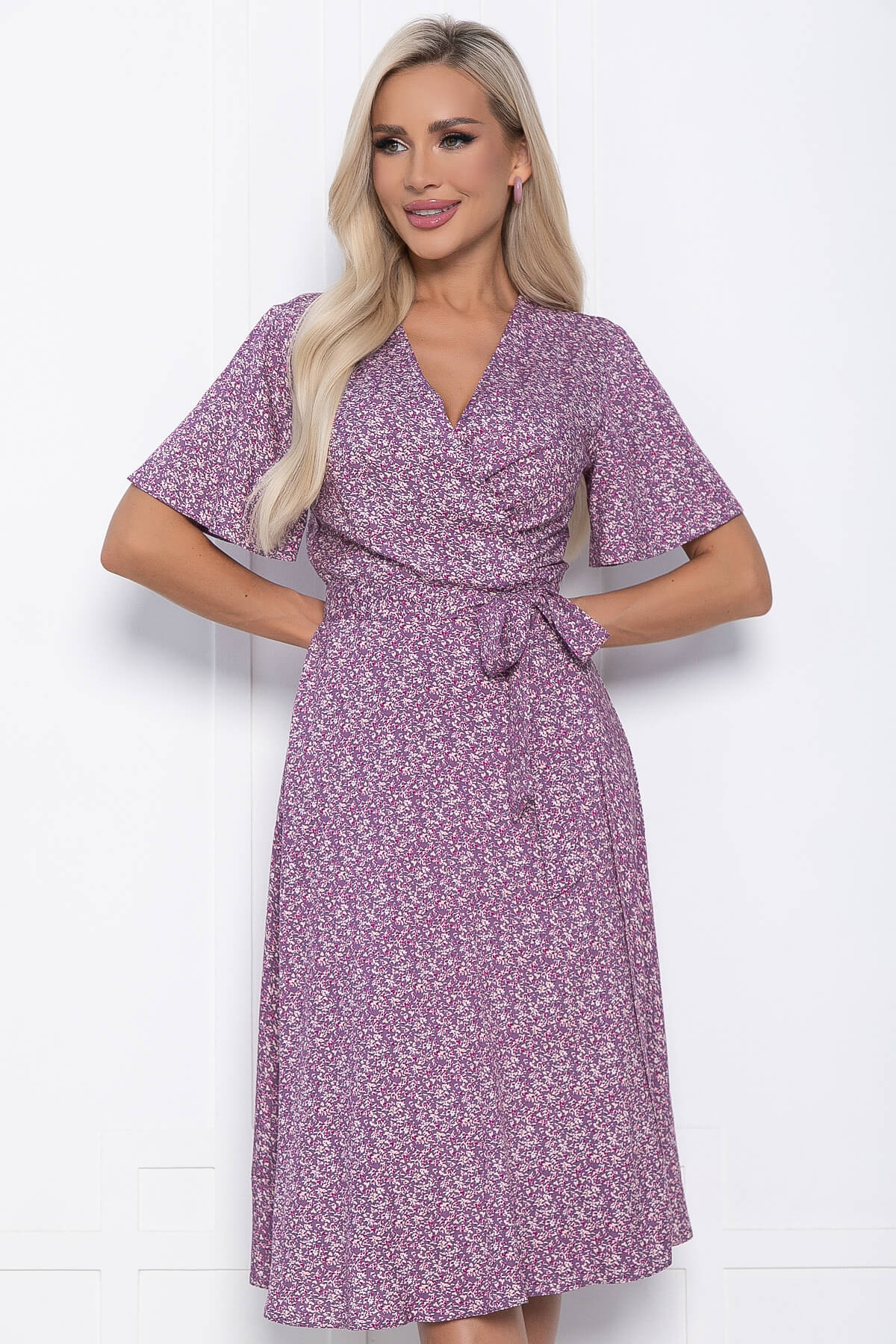 Яркое платье не оставит вас без внимания окружающих! Стильное платье, в котором вы будете ощущать себя женственно и привлекательно. Платье на запах со вшитым поясом обеспечит комфорт. Рукав укороченный, цельнокроеный.