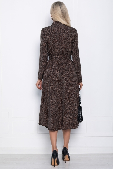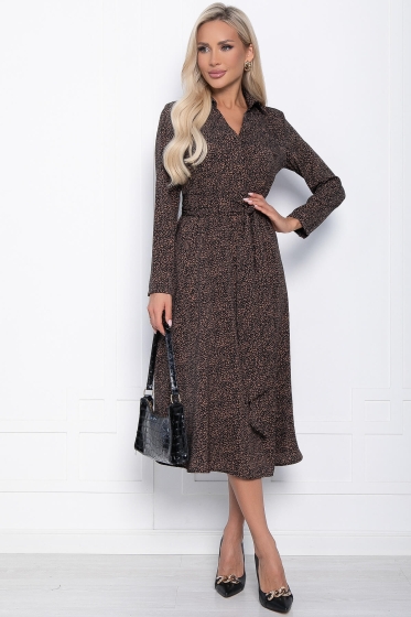 Красивое платье средней длины станет отличным дополнением к вашему гардеробу! Оно прекрасно сядет на любую фигуру, включая пышные формы, и поможет скрыть недостатки, а также подчеркнуть достоинства. Этот фасон идеально подходит для повседневных мероприятий и хорошо сочетается с обувью на каблуке. Платье отрезное по талии. Лиф спереди - на запах, юбка -пышная. Воротник на стойке.