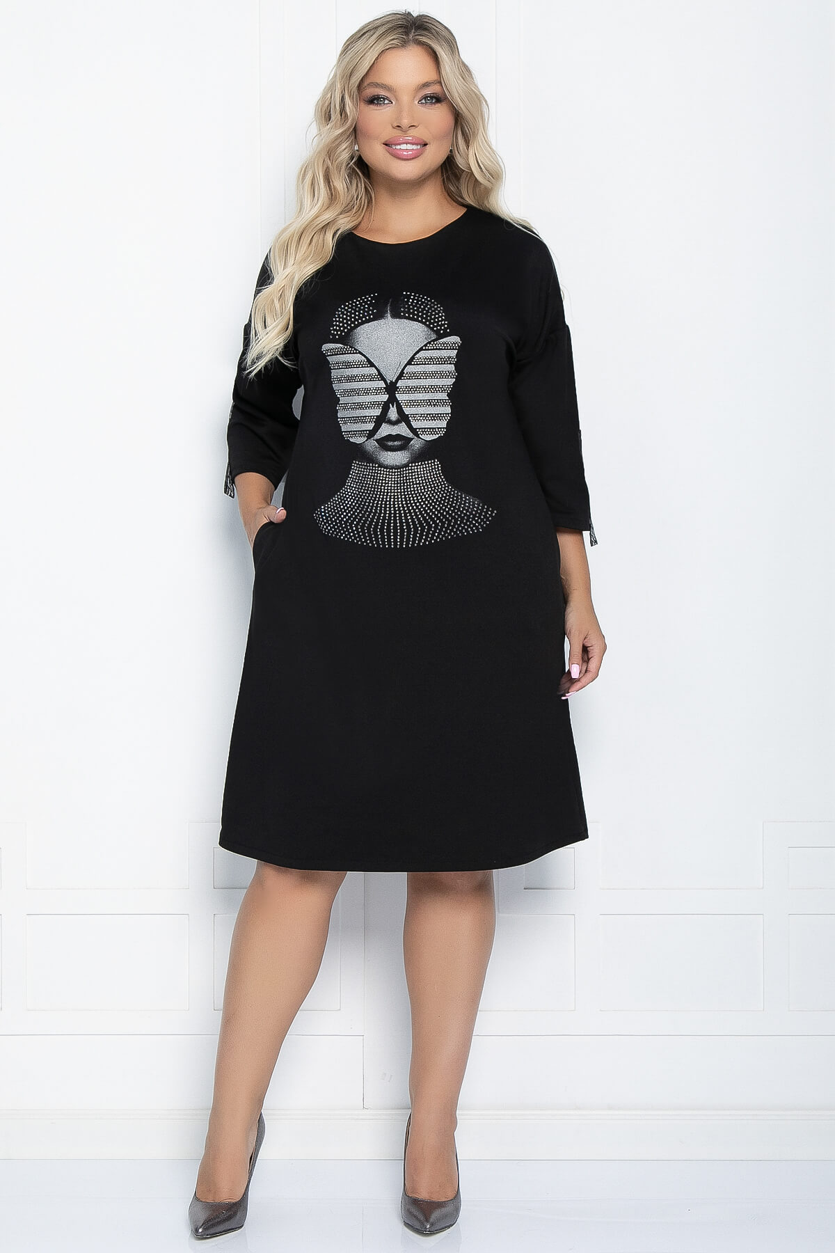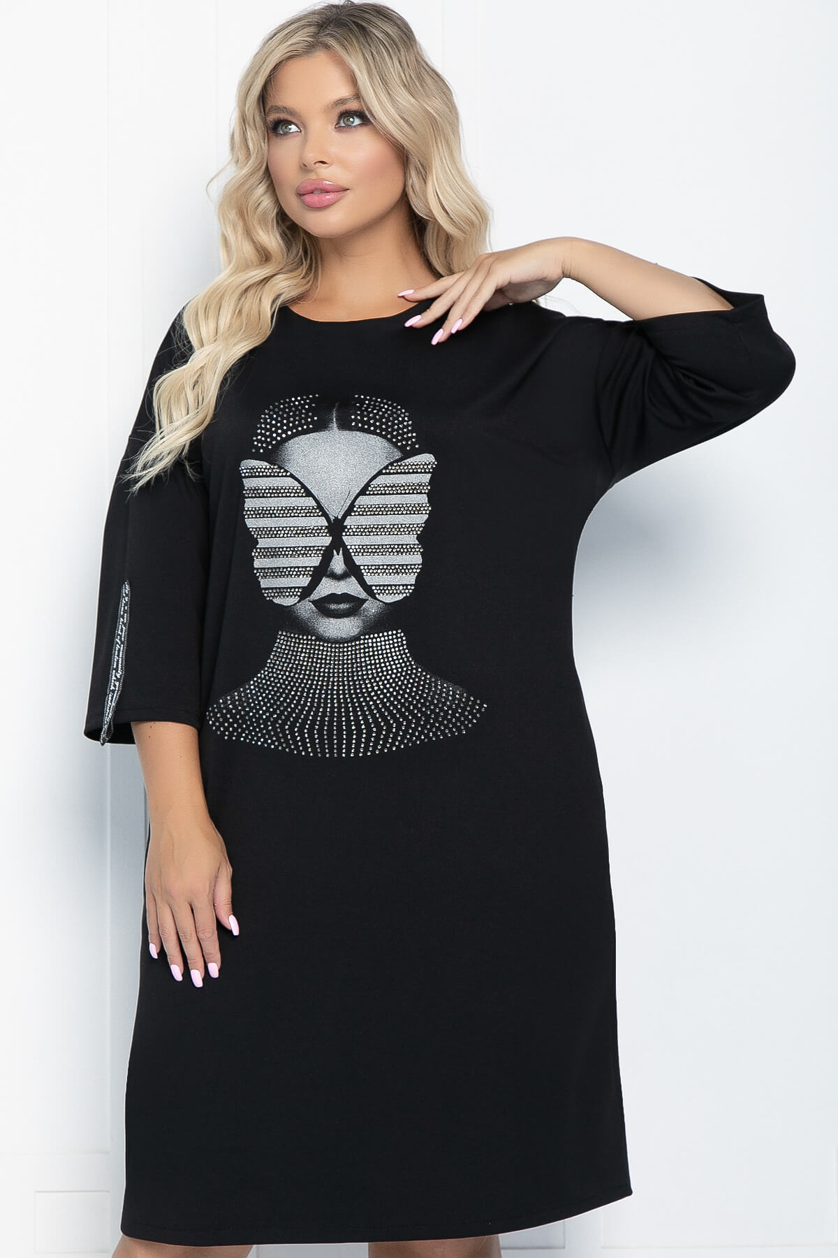 Платье-туника в стиле oversize подойдёт для создания стильного и комфортного повседневного образа. По передней части платья выполнена аппликация, благодаря которой эту модель можно использовать для создания вечернего образа. Платье свободного кроя, средней длины, линия плеча спущена. Такое платье можно надеть, как с ботинками на тракторной подошве, так и с лодочками на каблуке.